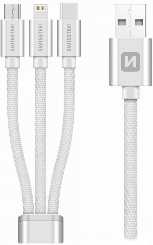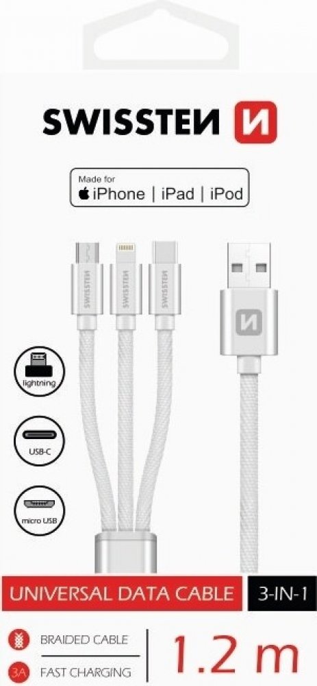 Univerzální datový kabel USB s délkou 1,2m. Disponuje všemi konektory. MicroUSB, USB-C a certifikovaný Lightning MFi. Díky tomu je vhodný pro všechny typy smartphonů. Baleno v blistru SWISSTEN.
