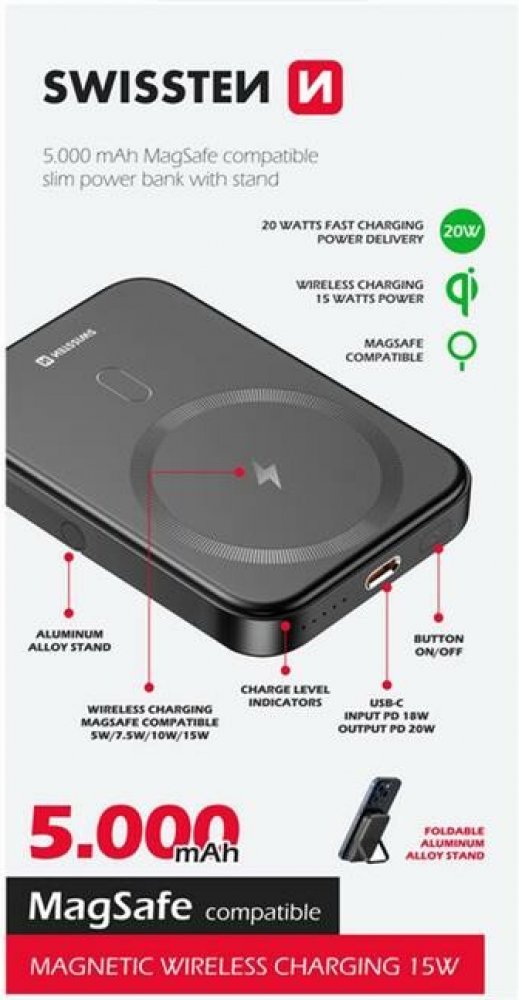 Potřebujete mít u sebe neustálý dostatek energie pro Vaše zařízení, ale nechcete, aby Vám powerbanka zabírala zbytečně moc místa? Tím pádem je pro vás Swissten MagSafe powerbanka s kapacitou 5.000 mAh skvělou variantou. Pokud máte zařízení, které podporuje bezdrátové nabíjení skrze protokol QI, nebudete nadále muset pro nabíjení řešit žádné kabely. Telefon jednoduše přiložíte na plochu powerbanky,...