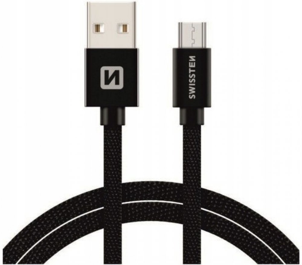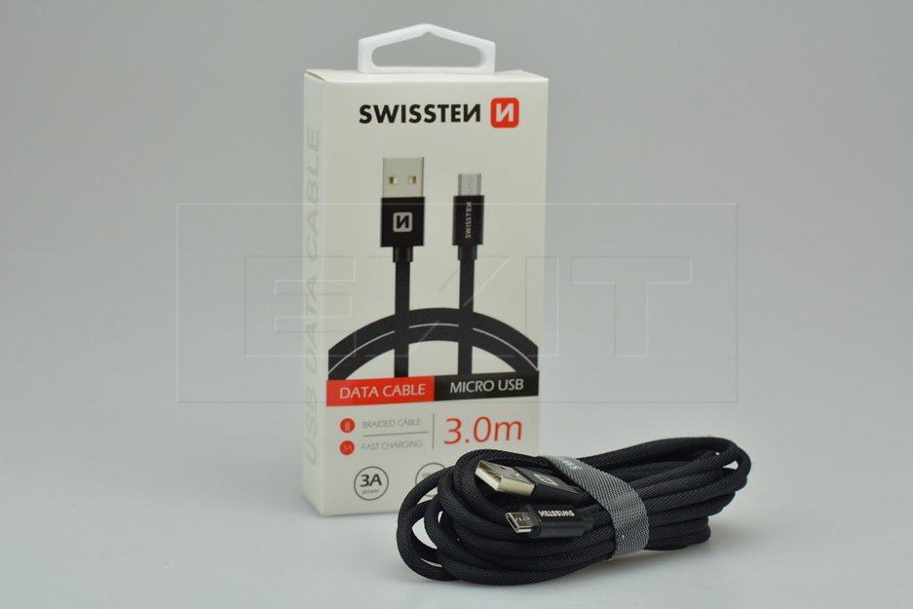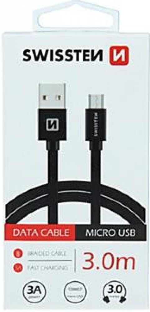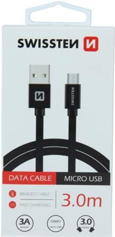 Kvalitní textilní datový kabel USB / Micro USB o délce 3,0 m. Kabel je zesílený, aby poskytoval vyšší proud (až 3 A) a zvládl rychlý přenos dat rychlostí 480 Mb/s. Datový kabel můžete použít pro propojení mobilního telefonu, tabletu nebo třeba Mp3 přehrávače s počítačem či notebookem. Datový kabel Swissten USB/Micro USB s vysoce kvalitním textilním opletením a kovovými kryty konektorů. S délkou 3 metry je vhodný pro nákladní automobily, rodinná auta nebo cestování. Kabel je zesílený, a proto může přenášet vyšší proud až 3A. Zvládne také rychlý přenos dat rychlostí 480 Mb/s.