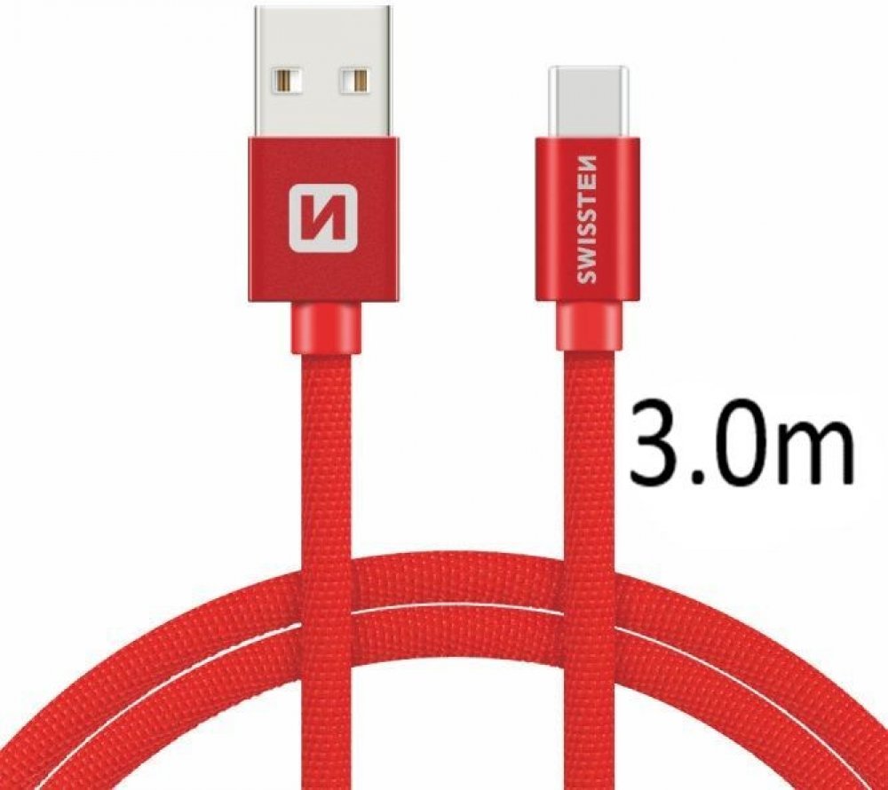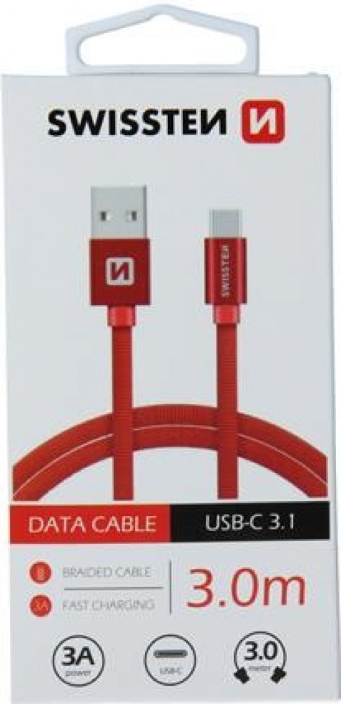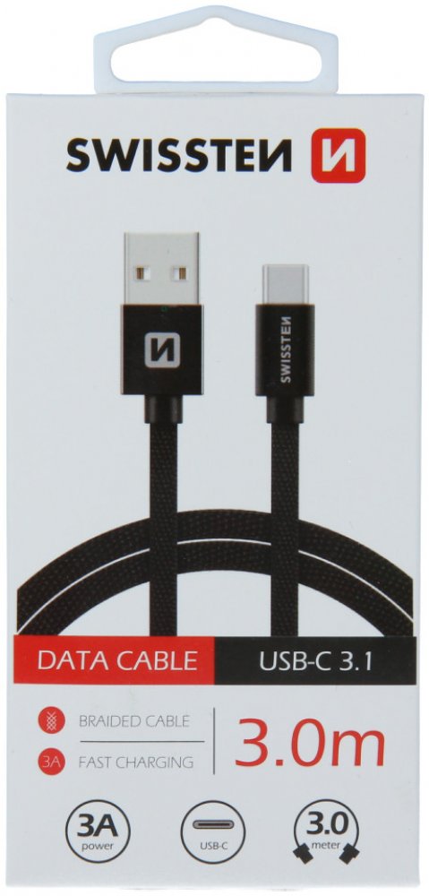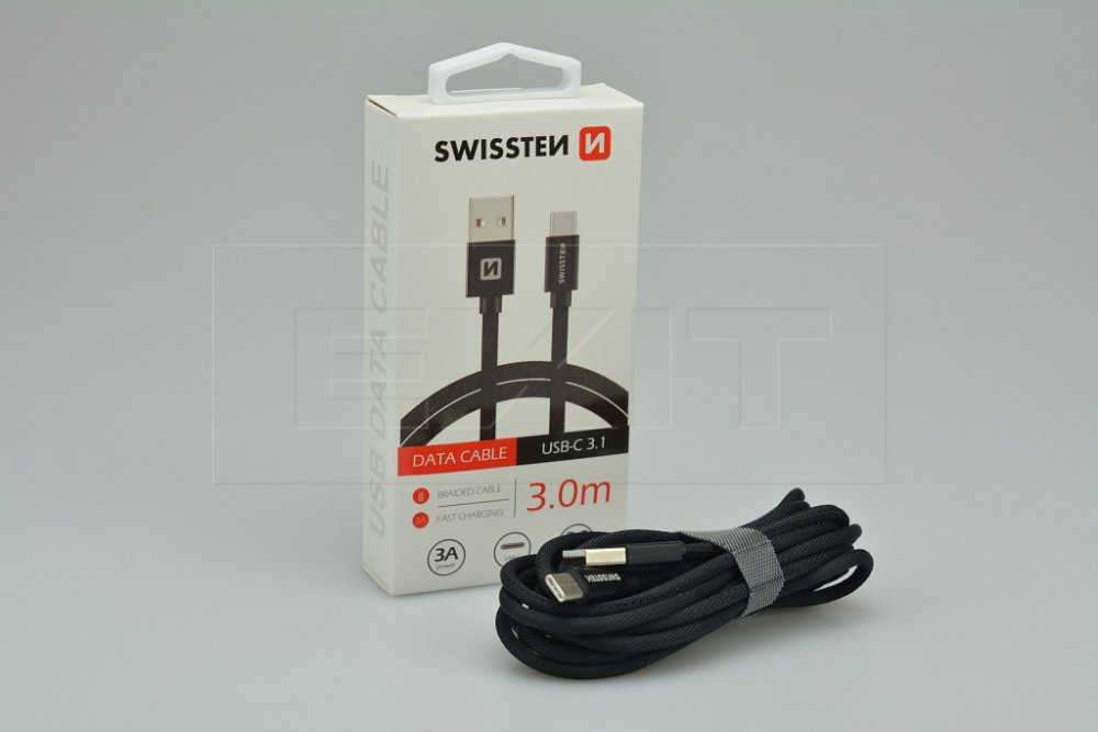 Kvalitní textilní datový kabel USB / USB-C o délce 3,0 m. Kabel je zesílený, aby poskytoval vyšší proud (až 3 A) a zvládl rychlý přenos dat 480 Mb/s. Datový kabel můžete použít pro propojení mobilního telefonu, tabletu nebo třeba Mp3 přehrávače s počítačem či notebookem. USB -USB -C kabel s kovovými špičkami a drát potažený látkou pro lepší odolnost. Datový kabel SWISSTEN USB-A na USB-C vám umožní efektivně nabíjet vaše zařízení. Díky vysoce kvalitnímu textilnímu opletení je kabel odolný proti poškození i zamotání. Oba konektory jsou opatřeny odolnými kovovými krytkami. Kabel umožňuje nabíjení proudem až 3A a přenos dat rychlostí až 480 Mb/s.