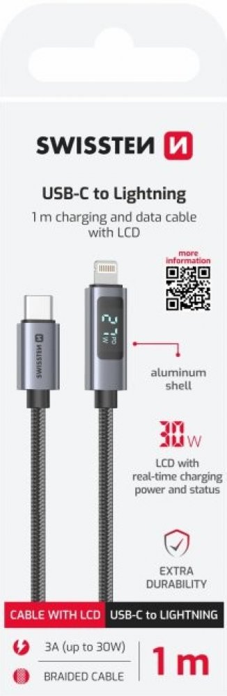 SWISSTEN LCD kabel USB-C / Lightning 1 m přináší revoluční způsob, jak mít neustálý přehled o průběhu nabíjení vašeho zařízení. Díky integrovanému LCD displeji okamžitě vidíte aktuální výkon ve wattech a indikaci technologie Power Delivery, což vám umožní efektivně kontrolovat rychlost nabíjení.