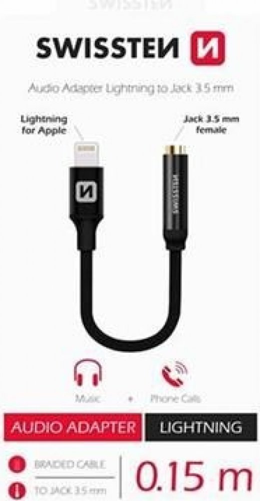 Kabel - redukce (přechodka) Lightning JACK 3,5mm s kvalitním textilním opletením a kovovými kryty konektorů.Určeno pro připojení Apple zařízení - iPhonu, iPadu s výstupem Lightning na sluchátka s 3,5mm jack konektorem.Podporuje funci poslechu hudby i telefonování.Délka 0,15m. Kryt konektorů: eloxovaný hliník.Barva černá.Baleno v krabičce se závěsem.