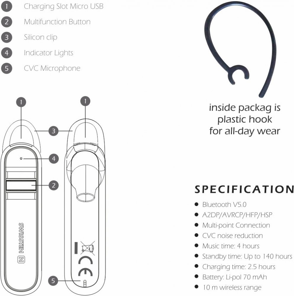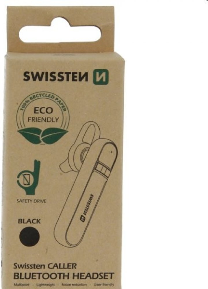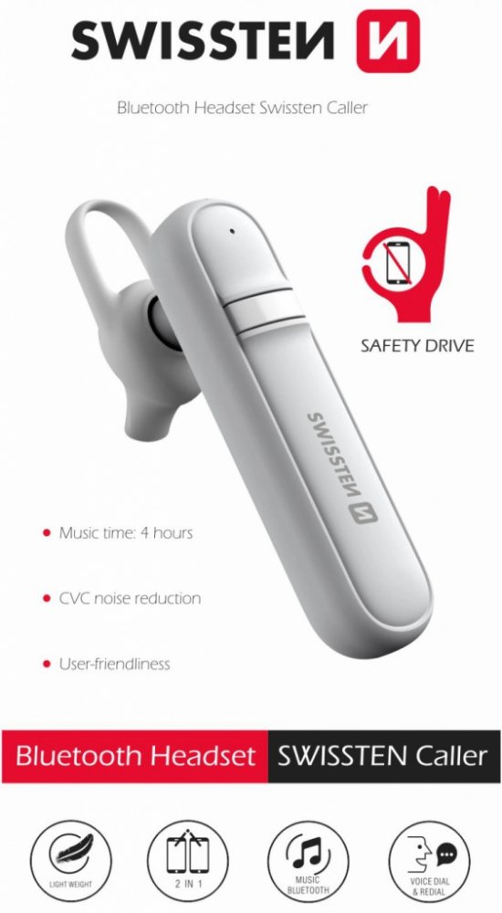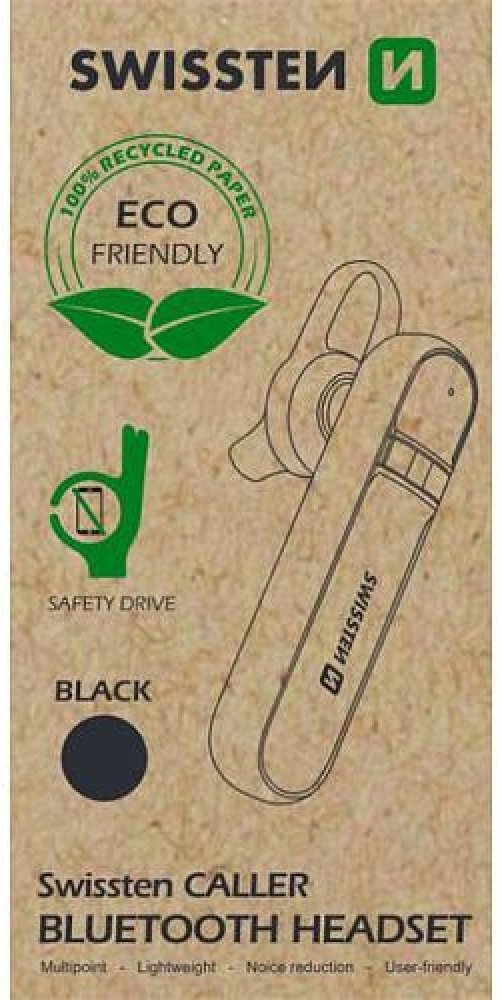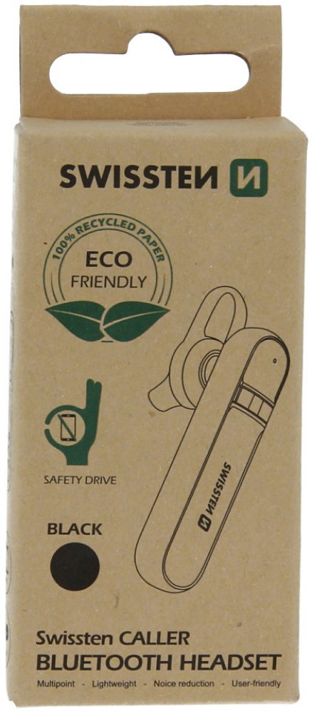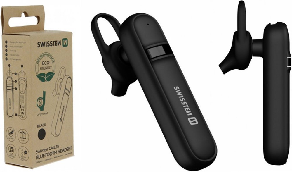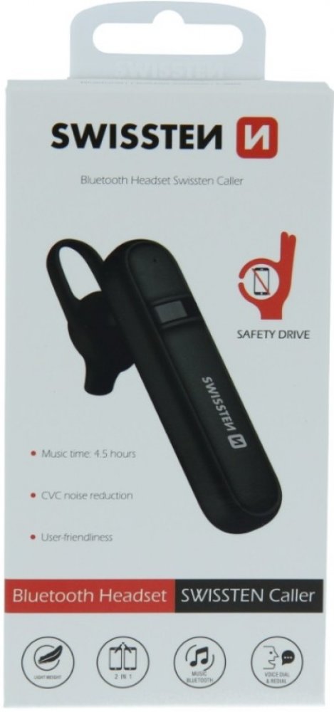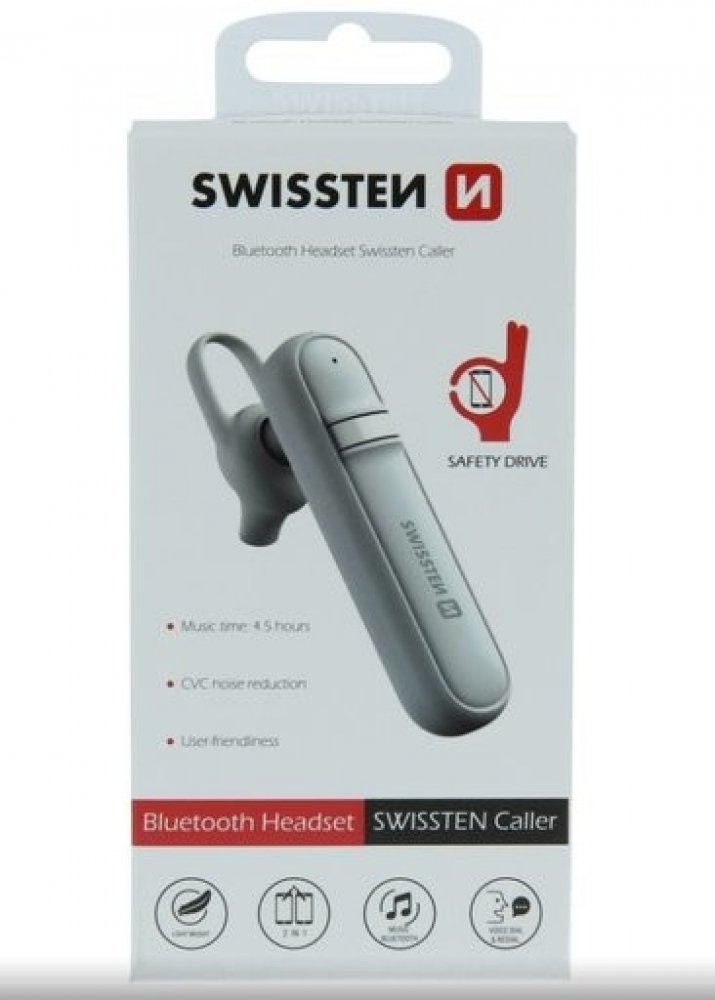 Lehký bluetooth headset SWISSTEN CALLER, s príjemným ergonomickým designem pro bezpecné telefonování. Baleno v blistru SWISSTEN.