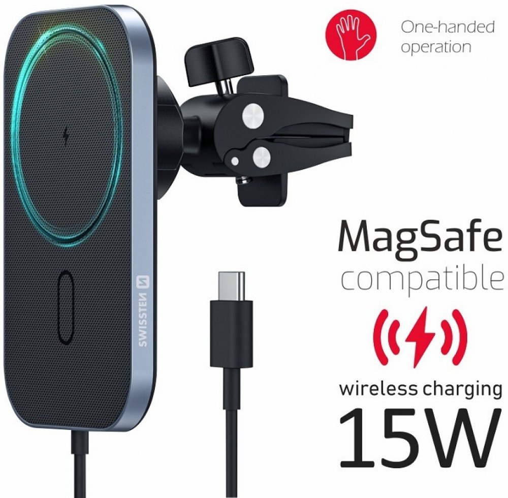 Magnetický držák Swissten s podporou MagSafe určený do větrací mřížky s bezdrátovým dobíjením a vysokým výkonem 15 W.