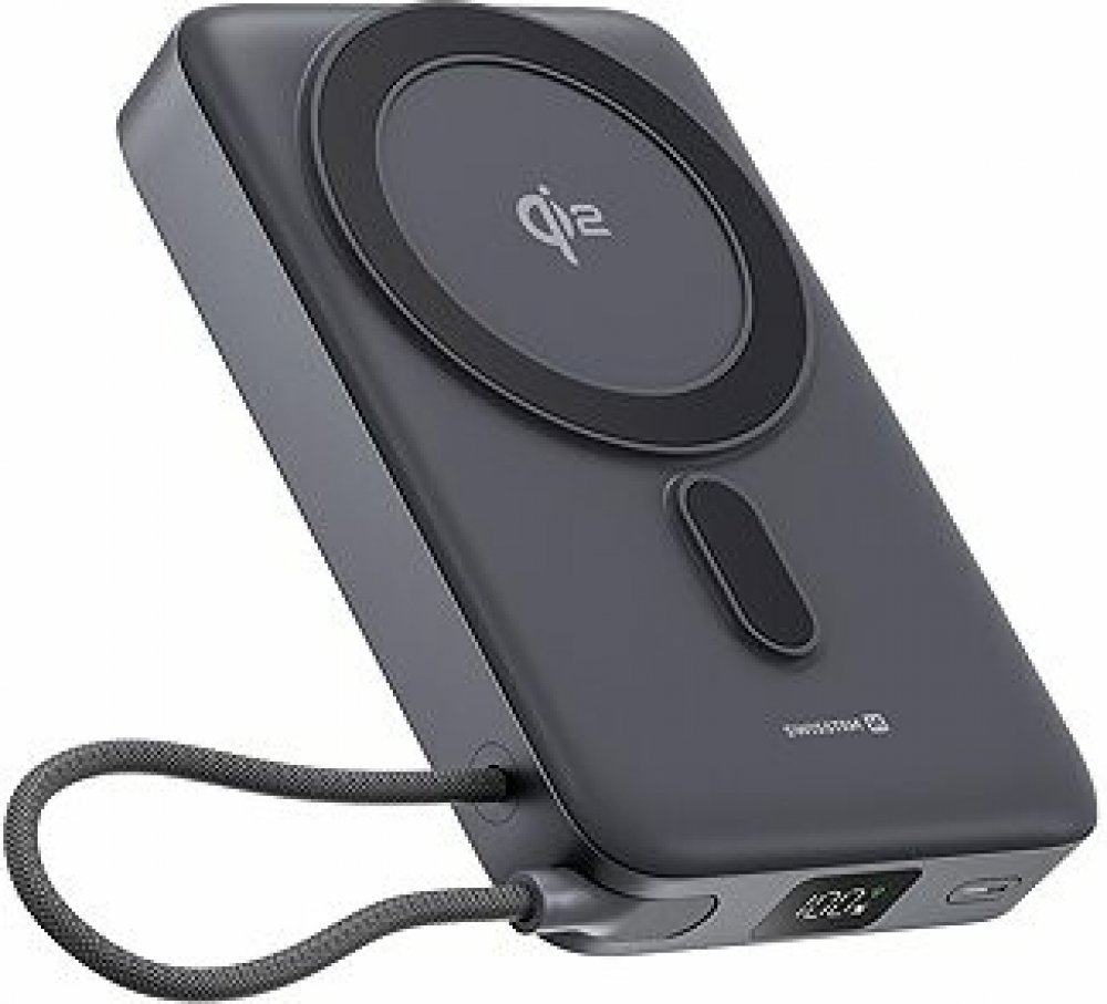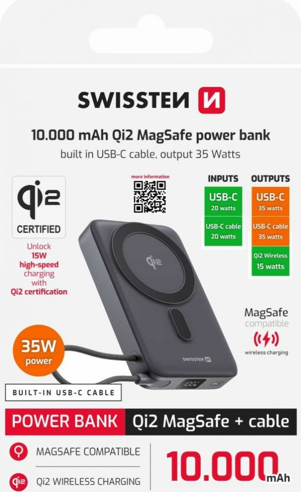 Máte s sebou na dovolené svá zařízení, ale nikde není k dispozici zásuvka? Spolehněte se na powerbanku Swissten. Je vybavena 10000mAh integrovanou baterií, takže výborně poslouží jako zásobárna energie na cestách. Poskytne vám nabíjení s kabelem i bez něj. Nabíjecí výkon drátového nabíjení dosahuje 35 W a při bezdrátovém nabíjení získáte až 15 W. Lze napájet 3 zařízení společně. Mezi výstupy, jež jsou rozmístěny na těle powerbanky, se řadí USB-C. Velikost elektrické energie vám udává výstupní proud. Swissten powerbanka napájí minimálním proudem 3 A. Snadno vám tedy vystačí pro napájení tabletů a chytrých telefonů. Napětí výstupu nabízené powerbanky se pohybuje od 5 do 15 V. Zásluhou jejích rozměrů 75 × 30 × 72 mm (vך×h) ji snadno uložíte do malé tašky či batohu. Zásadní vlastnosti powerbanky Swistten MagSafe Qi2 15 W, 10000 mAh s integrovaným kabelem USB-C černá Velkokapacitní powerbanka Swissten je opatřena 10000mAh vestavěnou baterií Umožní napájení i bez dostupné elektřiny Nabíjecí výkon s kabelem...