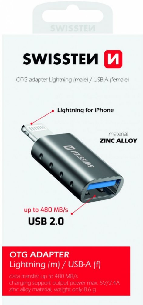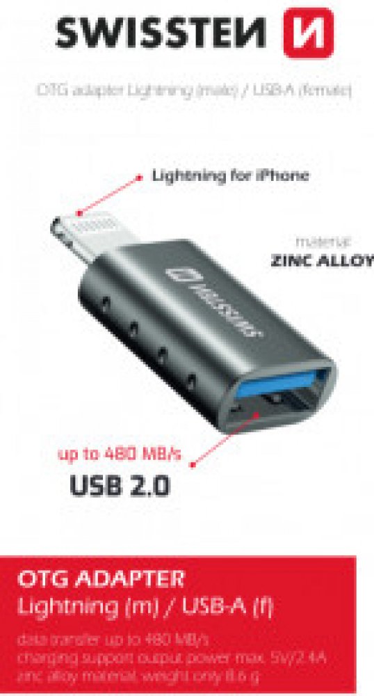 Miniaturní OTG adaptér umožňuje připojit zařízení s konektorem USB 2.0 do Lightning. Podporuje datové přenosy až do rychlosti 480 Mb/s. V případě nabíjení podporuje nabíjecí proud až 2,4 A a napětí až 5 V. Kryt adaptéru je vyroben z odolného materiálu na bázi zinku.