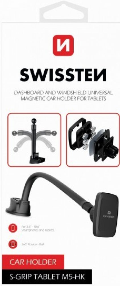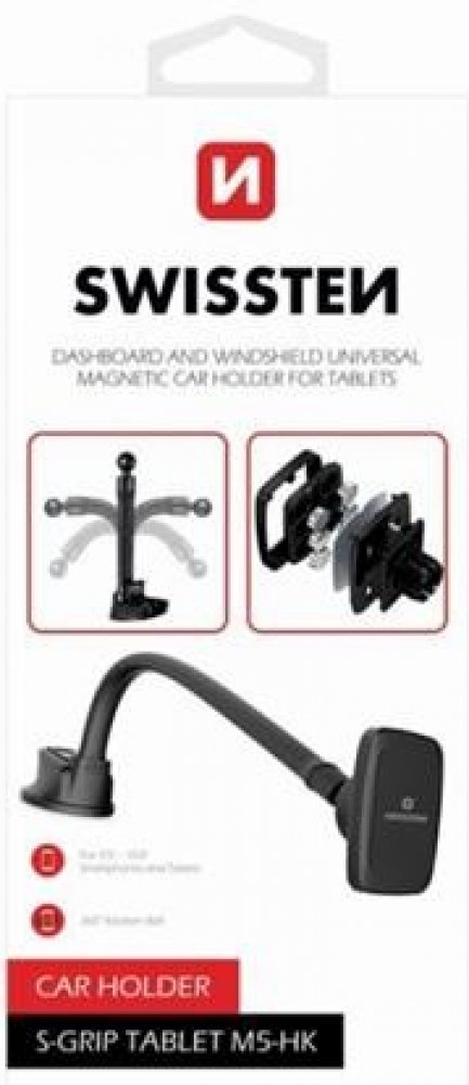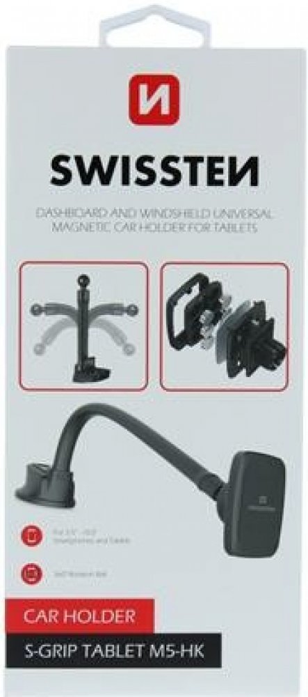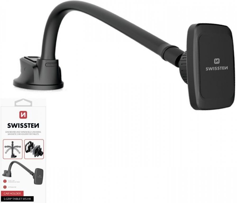 • Typ produktu: magnetický držák do auta na tablet / telefon • Umístění: čelní sklo / palubní deska • Uchycení zařízení: magnetické • Počet magnetů: 6 • Délka husího krku: 36 cm • Uchycení držáku: přísavka + nanopodložka • Konstrukce: antivibrační, bez čelistí • Kompatibilita: smartphony a tablety • Barva: černá • Značka: Swissten • Balení: blistr