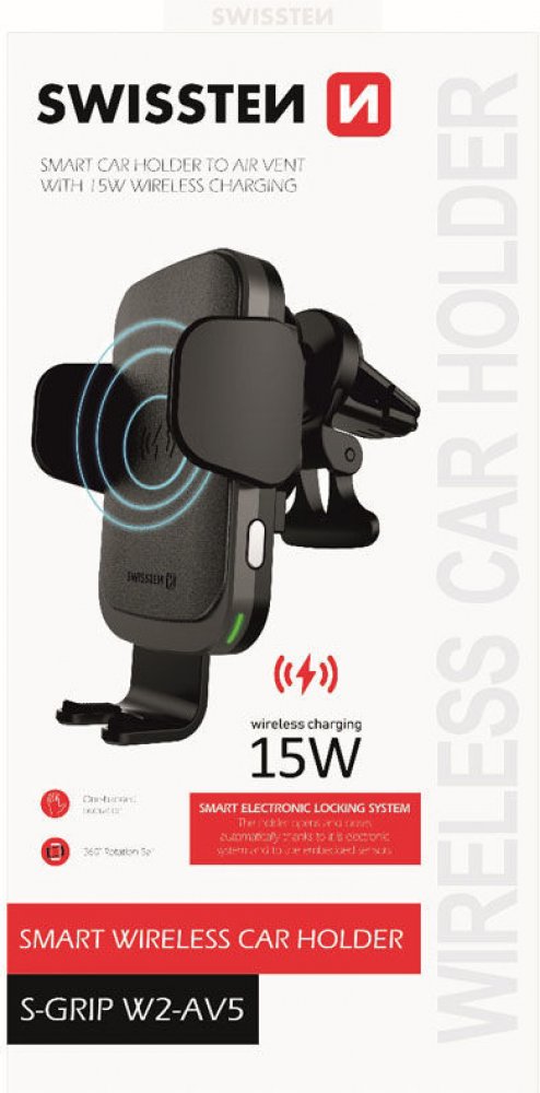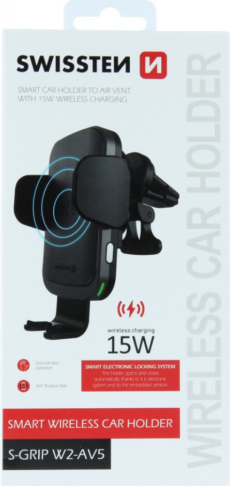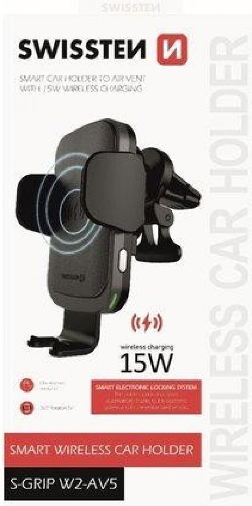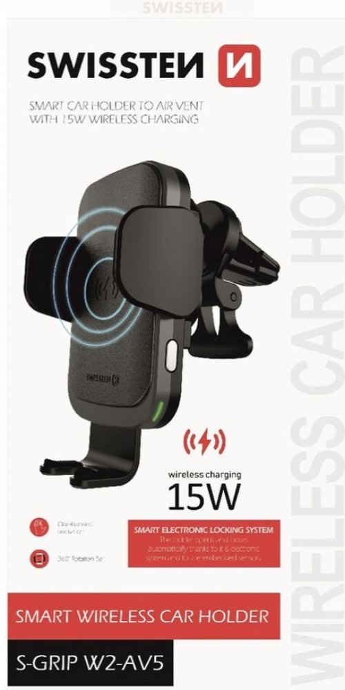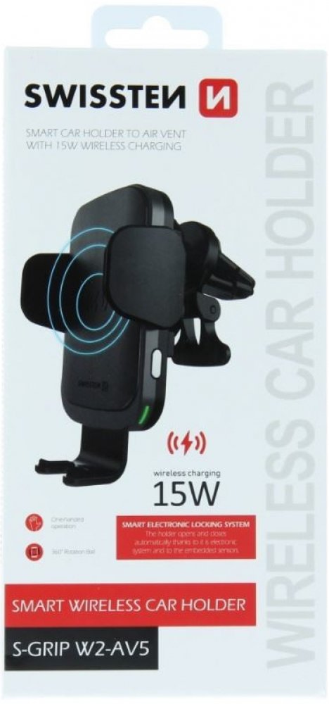 Držák do auta s bezdrátovým nabíjením SWISSTEN S-GRIP W2-AV5 je určen pro umístění do větrací mřížky. Držák disponuje rychlým nabíjením s výkonem15W. Baleno v blistru Swissten.