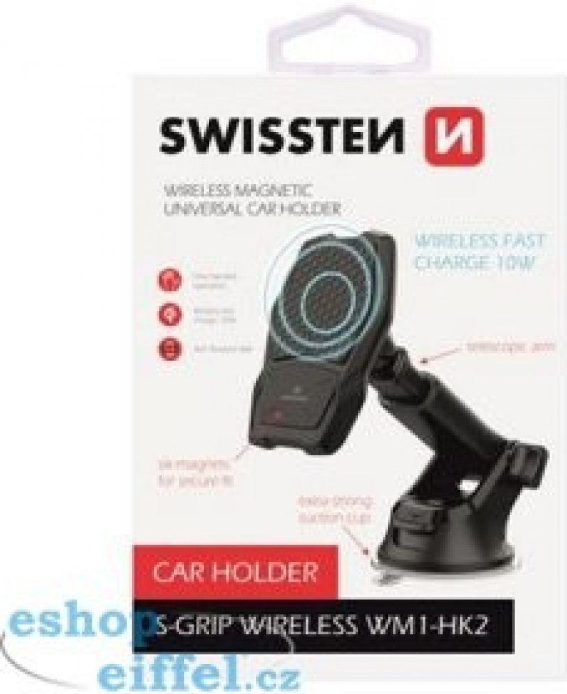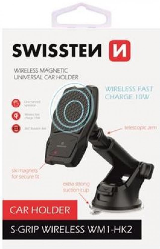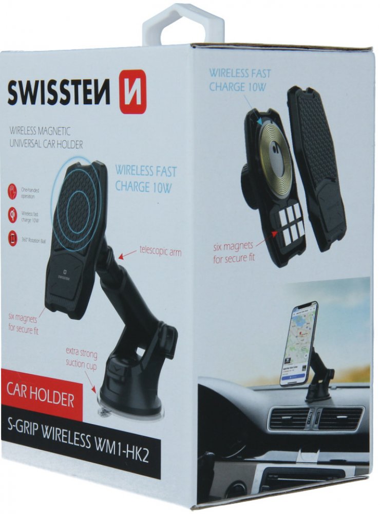 Magnetický držák do auta s bezdrátovým nabíjením SWISSTEN S-GRIP WM1-HK2 je určen pro připevnění na palubní desku. Držák disponuje rychlým nabíjením s výkonem 10W. Magnet je umístěn ve spodní části. Baleno v blistru Swissten.