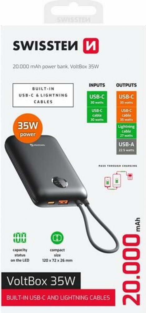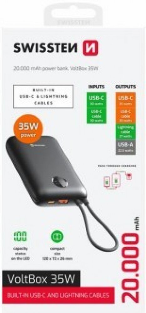 Hledáte výkonnou a kompaktní powerbanku, která vám umožní nabíjet více zařízení najednou a eliminuje potřebu nosit samostatné kabely? Našli jste správně! SWISSTEN POWER BANK VOLTBOX 35W 20,000 mAh je navržena pro moderní uživatele, kteří ocení integrované kabely USB-C a Lightning. Díky nim můžete pohodlně a rychle nabíjet jak zařízení s Androidem, tak iPhony.