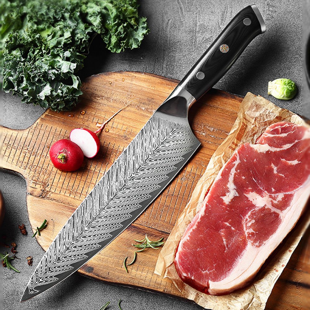 Délka čepele: 20 cmTloušťka: 2,2 mmMateriál čepele: Ocelové jádro Damašek VG10, 67 vrstevTvrdost: 60±2 HRCÚroveň ostrosti: Úhel 15° na každou stranuMateriál rukojeti: Ultraprémiová rukojeť G-10, černá barva 1.Materiál čepele: ocelové jádro Damašek Vg-10, 67 vrstev