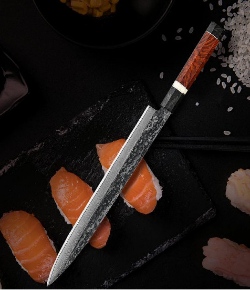 Délka čepele: 27 cmMateriál čepele: Damašková ocel VG10, 67 vrstevTvrdost: 60±2 HRCÚroveň ostrosti: Úhel 18° na stranuMateriál rukojeti: Uhlíkové vlákno a bílá pryskyřice/Rosewood Zahrnuje dárkové balení.