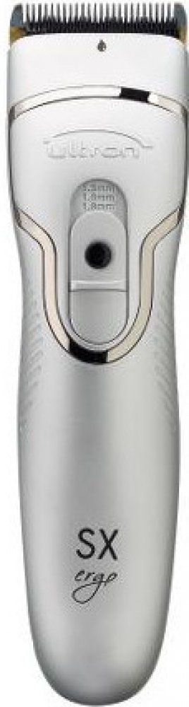 Zastřihovač vlasů a vousů Ultron SX Ergo přináší špičkový výkon a maximální přesnost díky svému výkonnému motoru s 7000 otáčkami za minutu, který zajišťuje rychlý a efektivní střih. Tento zastřihovač nabízí až 5 hodin akumulátorového provozu, což ocení každý, kdo potřebuje spolehlivý výkon po delší dobu bez nutnosti dobíjení. LCD displej je praktický pomocník, který Vás upozorní na nutnost mazání strojku a zároveň zobrazuje zbývající dobu provozu. Zastřihovač je vybaven keramicko-titanovou hlavicí o šířce 45 mm. Výšku střihu lze nastavit v rozmezí 1 mm až 1,9 mm. K dispozici jsou i plastové oboustranné nástavce o velikostech 3 mm a 6 mm, 9 mm a 12 mm, které poskytují větší variabilitu v délce střihu. Díky ergonomickému designu strojek skvěle padne do ruky a umožňuje snadnou manipulaci, což zajišťuje komfort při používání, ať už doma nebo v profesionálním salonu. Součástí balení je olej, čistící kartáček a adaptér na dobíjení.Barva: stříbrnáProvoz: akumulátorovýVlastnosti: - profesionální zastřihovač vlasů- motor o výkonu 7000 ot./min.- keramicko-titanová hlavice o šířce 45 mm- výška střihu 1-1,9 mm- ergonomický design- snadná manipulace- vhodný také na vousy- LCD displej informující o stavu zastřihovače- doba provozu až 300 minutBalení obsahuje:- oboustranné plastové nástavce (3 mm, 6 mm, 9 mm a 12 mm)- čisticí kartáček- olej- nabíjecí adaptér