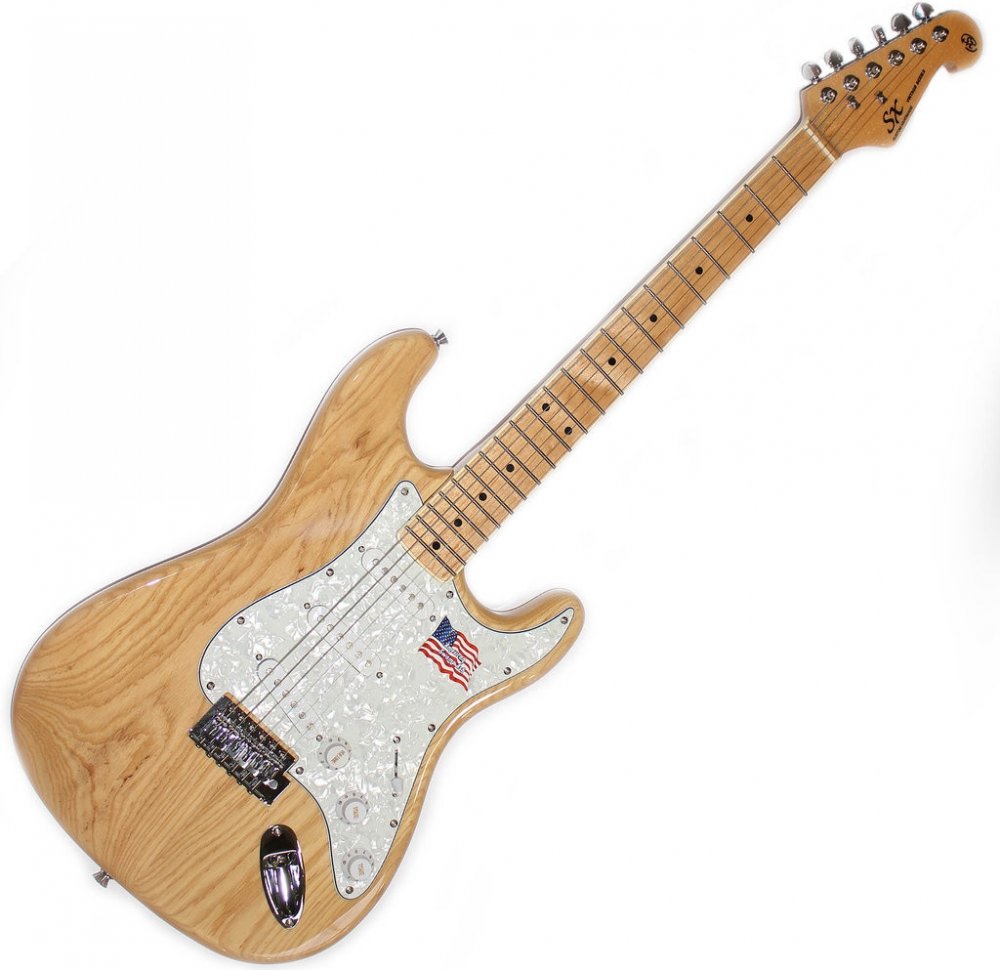 Elektrická kytara, Série Custom Hand Made. Tělo ve tvaru Stratocaster je vyrobeno z amerického bílého bahenního jasanu, javorový krk, javorový hmatník, 21 pražců Medium Jumbo, perleťový pickguard, 3 x Single snímač, 5-polohový přepínač, ovládání TONE, TONE, VOLUME. Kobylka s tremolit, chromovaný hardware bez zámků nultého pražce, barva Natural, vysoký lesk. Tremolo páka je součástí balení.