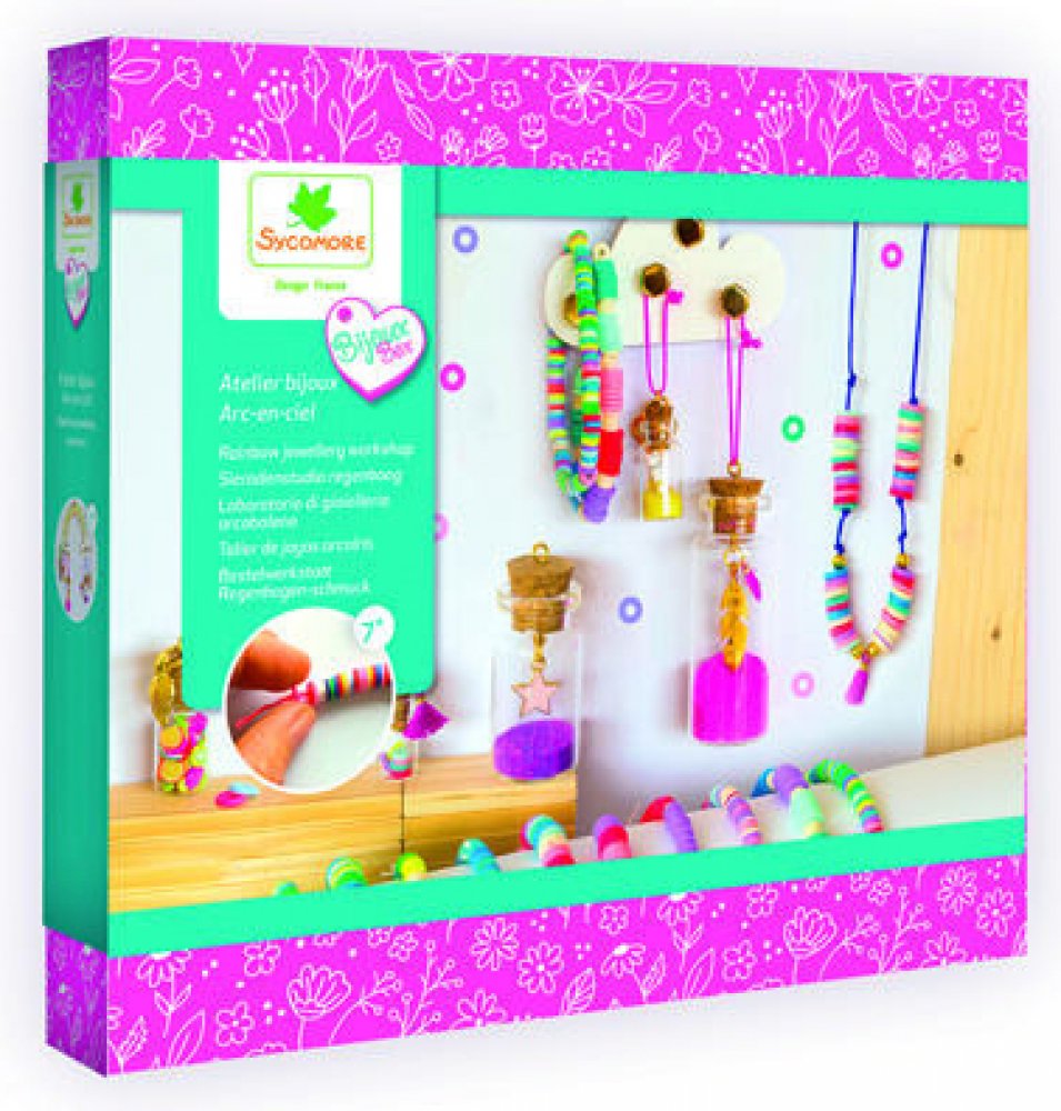 Šperkařská dílna. Kreativní šperkařská sada obsahuje vše, co potřebujete k výrobě originálních módních doplňků. Pomocí této sady si děti od 7 let vytvoří náramky z korálků Heishi a krásné neobvyklé šperky z malých lahviček. Korálky Heishi (čte se "híši") jsou malé ploché korálky, které se tradičně vyráběly z mušlí, kamenů nebo kostí. Jejich původ pochází z indiánských kmenů. Dnes se běžně vyrábějí z polymerové hmoty (fimo), dřeva nebo různých minerálů. Korálky Heishi jsou oblíbené při výrobě náramků nebo řetízků na kotník. Skvěle se kombinují s perličkami, zlatými komponenty nebo přívěsky. Díky svému tvaru se snadno navlékají na elastický vlasec nebo nylonovou šňůrku a vrstvením různých barev vytvářejí originální vzory. Vznikají tak barevné a hravé doplňky, které jsou lehké a pohodlné na nošení. Balení obsahuje: 5 lahviček různých velikostí s korkovou zátkou, pírko, list, 3 mini bambulky, klíč, mušli, lístek, 7 háčků, 8 šroubků, 9 kroužků, heishi korálky různých velikostí a barev, nakrájené ovoce v polymerové hmotě, hvězda, 3 trubičky písku, 3 nitě, zlaté korálky, duhový dřevěný stojan a návod. Doporučeno pro děti od 7 let. Velikost balení: 27 x 26 x 4,5 cm.