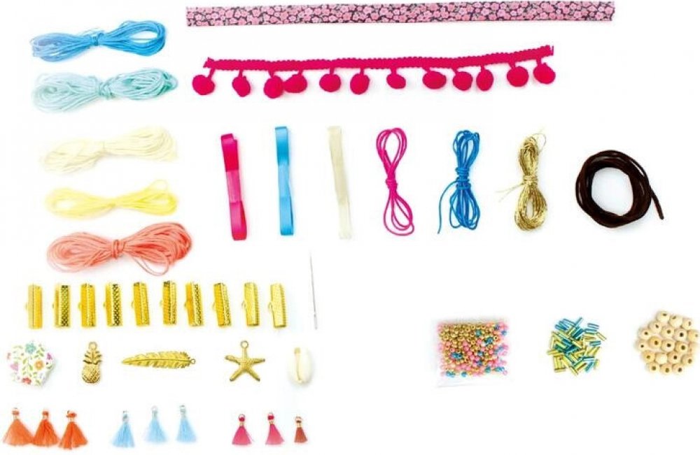 Kreativní šperkařská sada obsahuje vše, co potřebujete k výrobě originálních módních náramků. Pomocí této sady si děti od 7 let vytvoří barevné a hravé doplňky, které jsou lehké a pohodlné na nošení. Sada obsahuje: 25 m bavlněné nitě, 1,5 m voskované nitě, 100 korálků, 16 dřevěných korálků, 30 korálků v tubě, 25 cm kožené nitě, 25 cm stuhy s bambulkami, 3 ocelové přívěsky, 1 mušli, 1 potištěný kor...