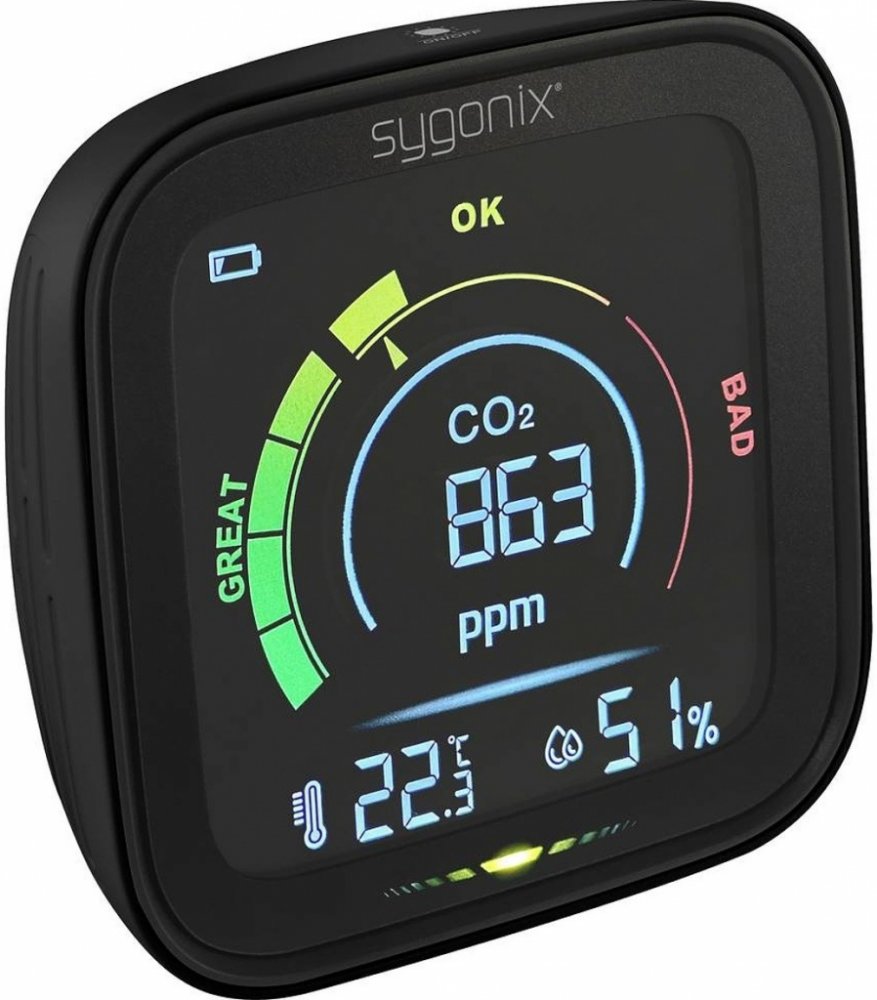 Měřič CO2 (kysličníku uhličitého) Sygonix SY-5609518 je určen pro vnitřní použití. Měří a zobrazuje na svém barevném inverzním displeji hodnoty CO2 ve vzduchu také teplotu a relativní vlhkost. Pro měření CO2, fotoakustické čidlo ).