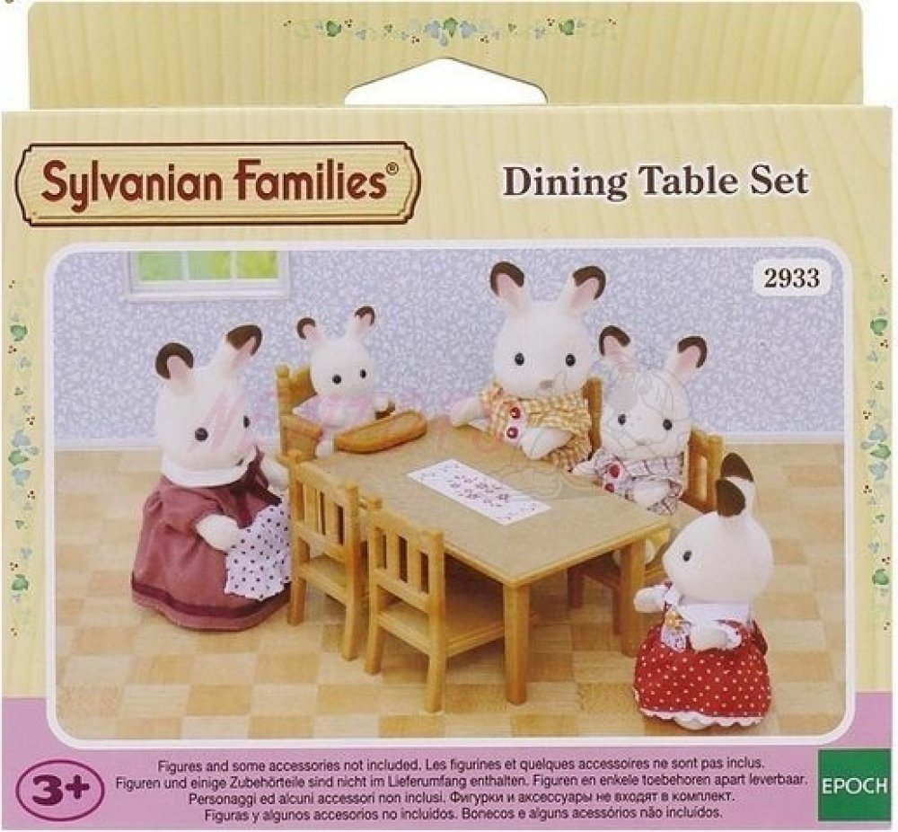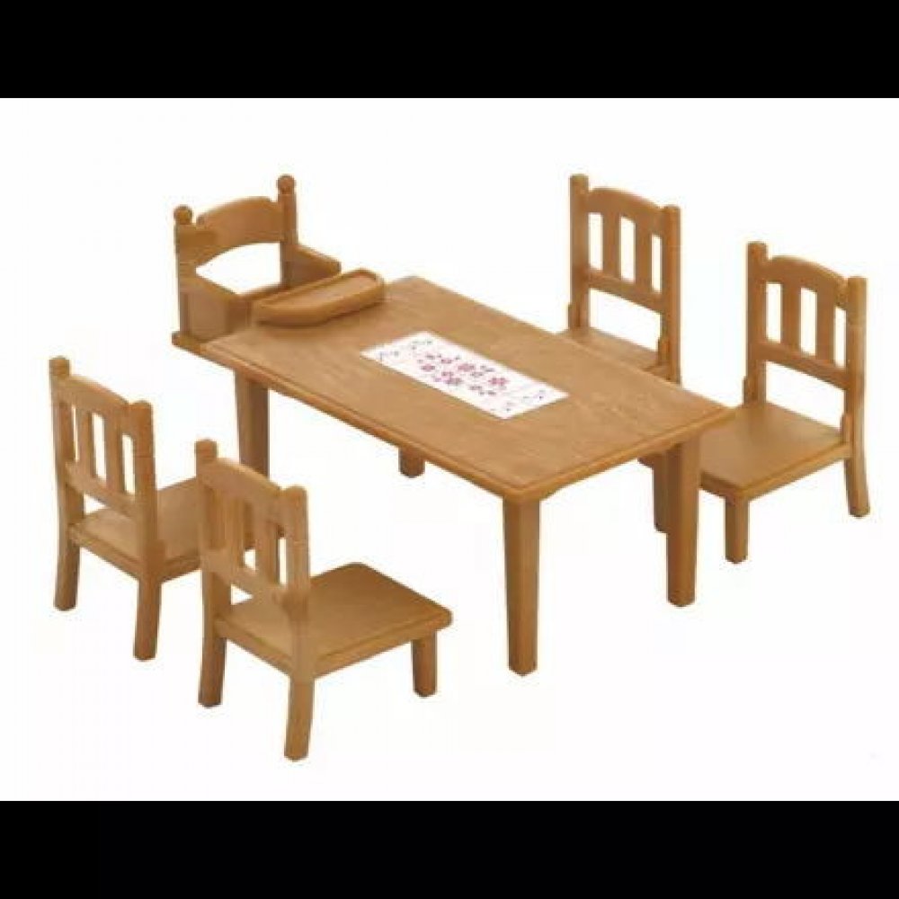 Velký jídelní stůl nabízí prostor pro celou rodinu. Pro nejmenšího králíčka je připravena dětská židlička. Stůl v této jídelní sadě od Sylvanian Families je dostatečně velký pro celou rodinu. Skvělý doplněk do jídelny nebo kuchyně. Díky 4 židlím a vysoké židli pro batole je tato sada ideální pro středně velkou rodinu s malým dítětem. Vysoká židle je odnímatelná, takže je zde ještě více místa pro dospělé! Stůl je ozdoben bílým/červeným ubrusem.