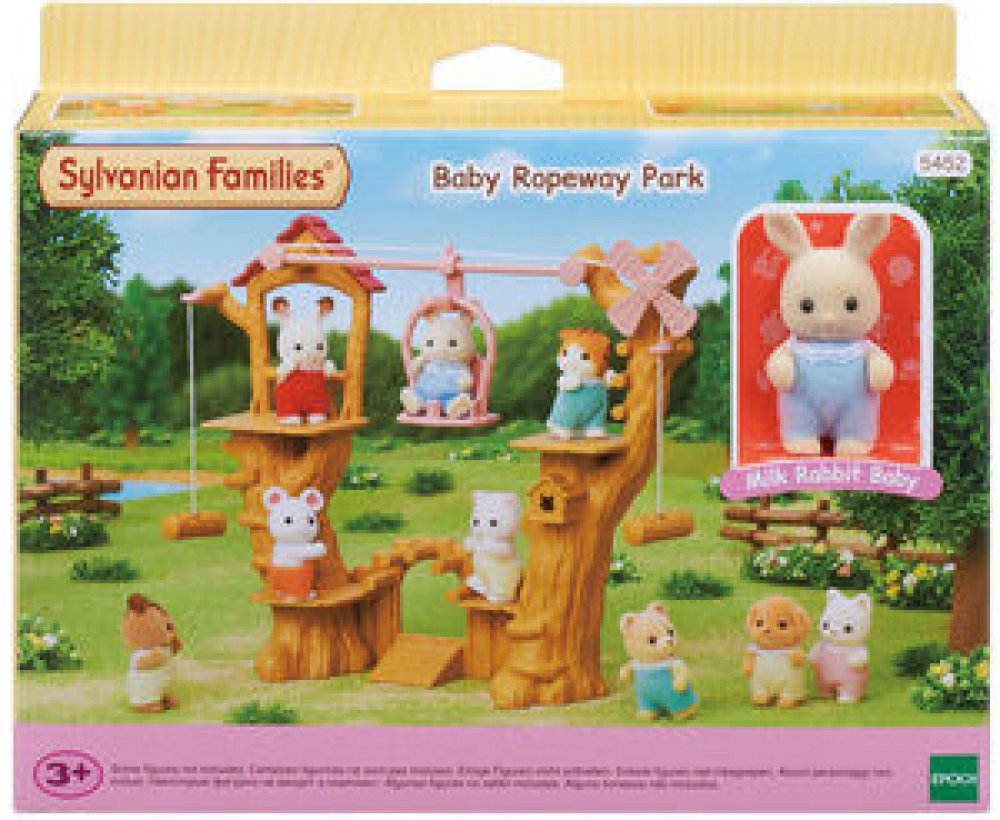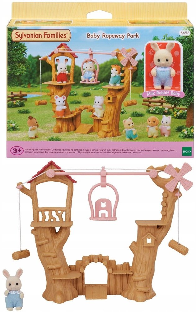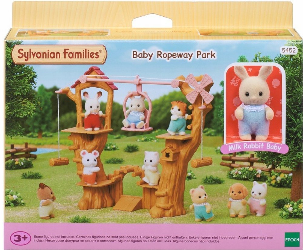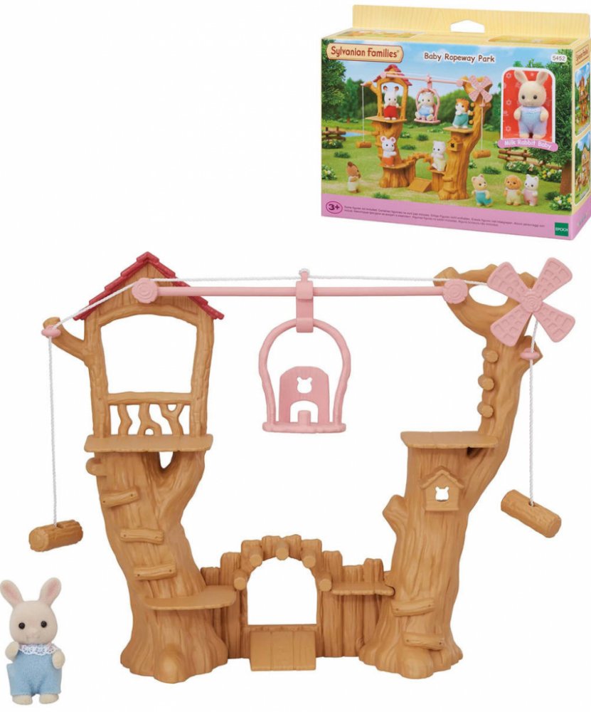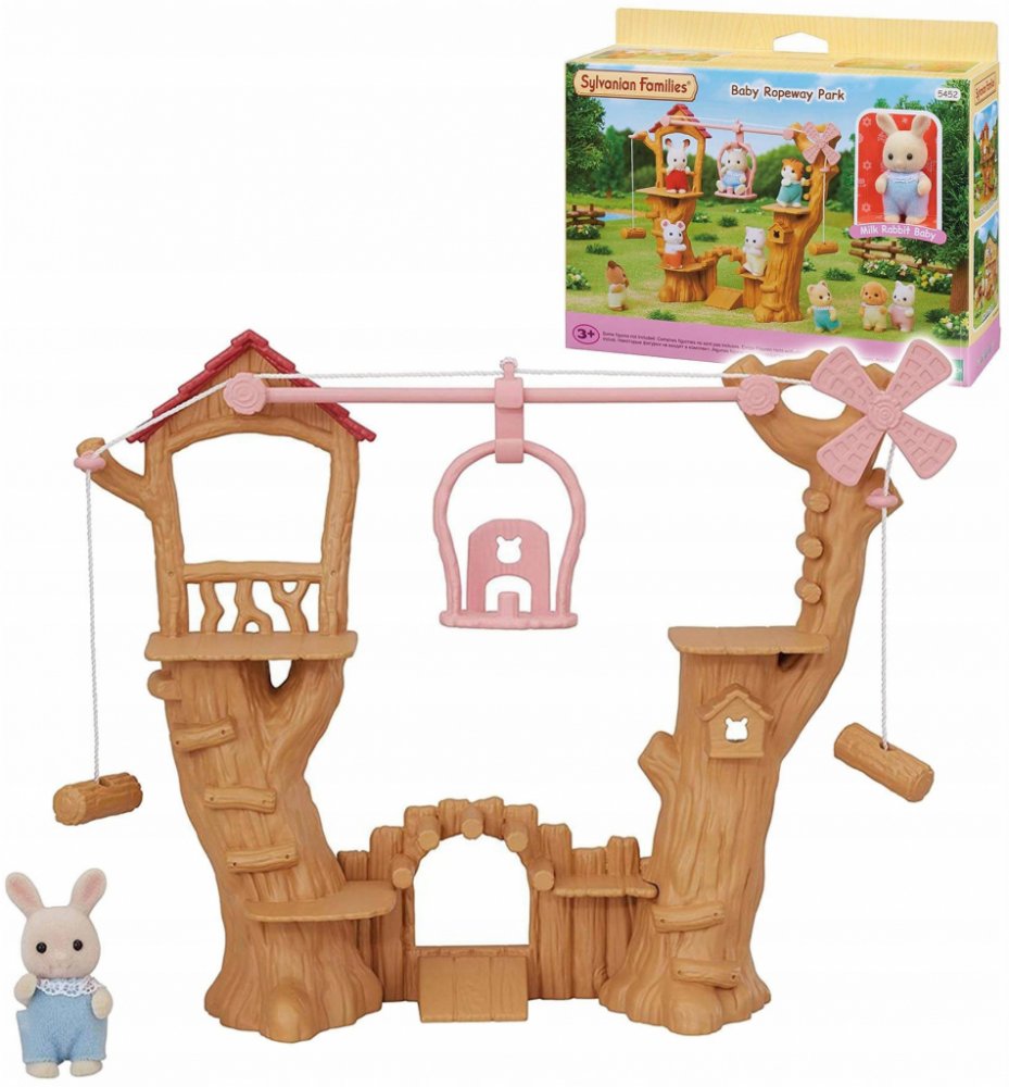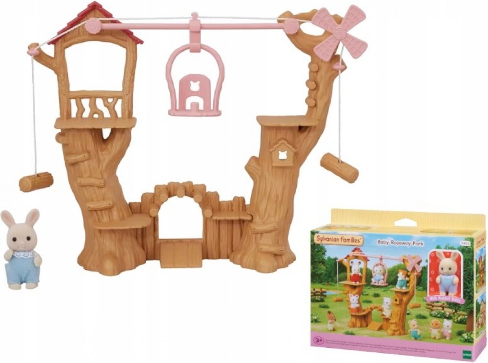 Dětské lanové prolézačky s lanovkou jsou originální příslušenství pro rodiny zvířátek Sylvanian family. Set obsahuje figurku Baby Milk králíčka, levou, prostřední a pravou část lanovky, gondolu a lano. Zatáhnutím za lano vlevo nebo vpravo pohybujete gondolou. Pod stromy je dobrodružné hřiště.