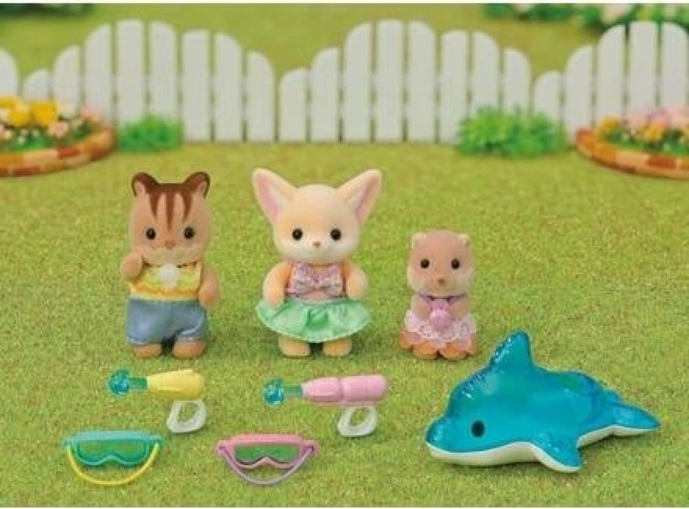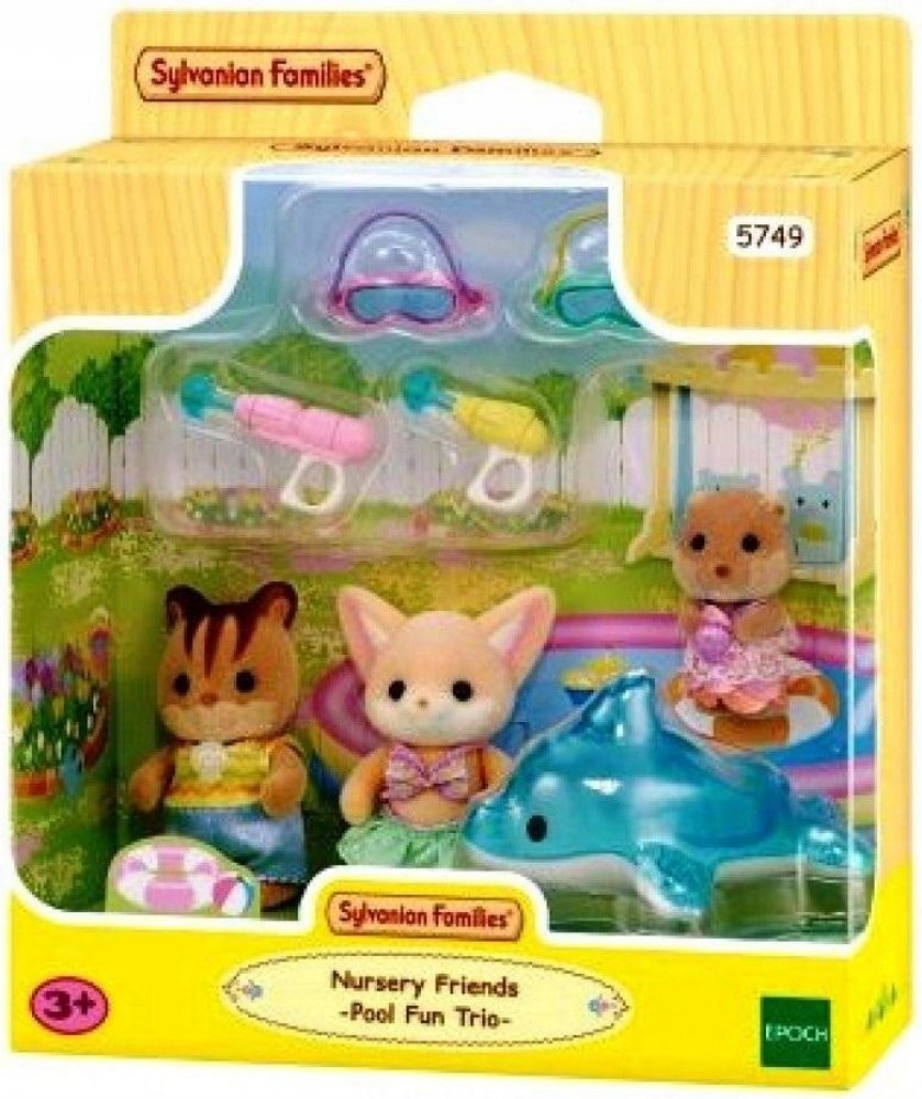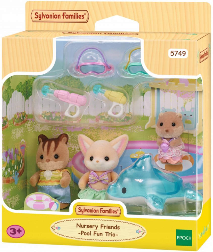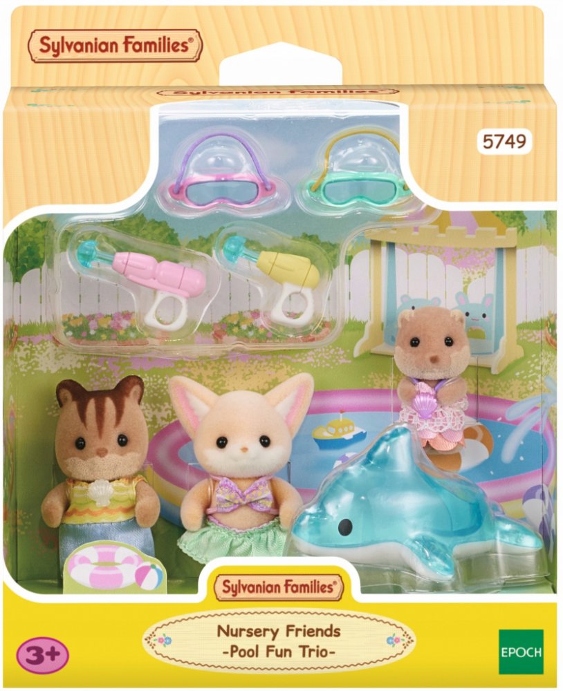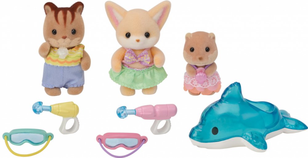 Sada Bazén Fun Friends obsahuje; 1 x figurka malého lišáka fenka, 1 x figurka dítěte veverky z vlašského ořechu, 1 x figurka vydry, 1 x hračka do bazénu s delfíny, 2 x vodní pistole, 2 x brýle.