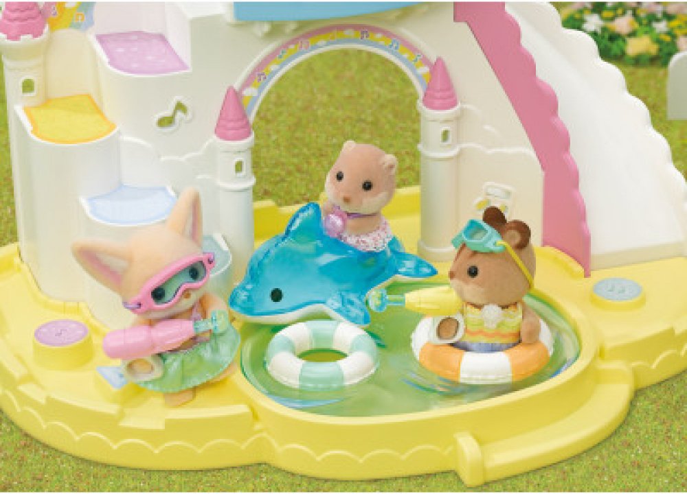 Miminko může jezdit na nafukovacím delfínovi. Děti mají na sobě roztomilé plavky se vzory a knoflíky. Stimuluje u dětí imaginativní hraní rolí.