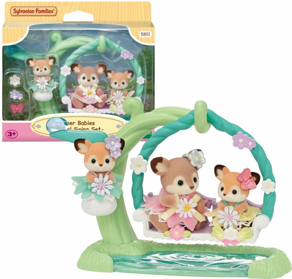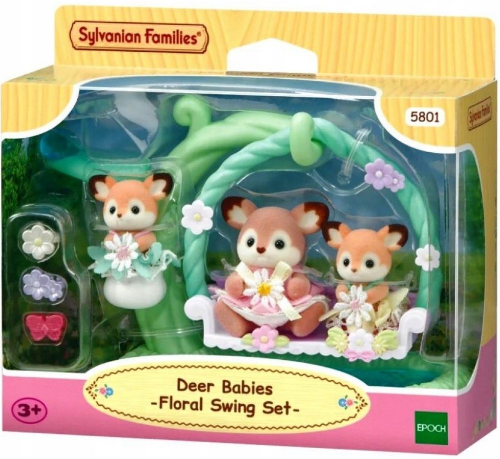 Poznej rodinu Jelínků Sylvanian Families. Tato sada obsahuje 3 rozkošné figurky dětí Jelínků a květinovou houpačku. Jelení holčičky Aster, Nova a Rose se vydaly ven, aby se pohoupaly na květinové houpačce. Nejstarší ze sourozenců Aster, má na sobě růžové šaty ve tvaru okvětních lístků, zatímco batolata Nova a Rose mají mátově zelené a žluté šaty s velkou vyšívanou květinou na přední straně. Děti rády sedí na květinové houpačce u vody a jemně se pohupují sem a tam. Postavičky lze oblékat a zdobit rozkošnými kolíčky. Hračky Sylvanian Families rozvíjejí představivost a podporují děti ve hře na role. Hra s figurkami rozvíjí kreativitu a učí emocím vytvářením a vyprávěním příběhů založených na každodenních zážitcích a pozorování světa. Vyznačují se nejvyšší kvalitou a výjimečným důrazem na detaily.