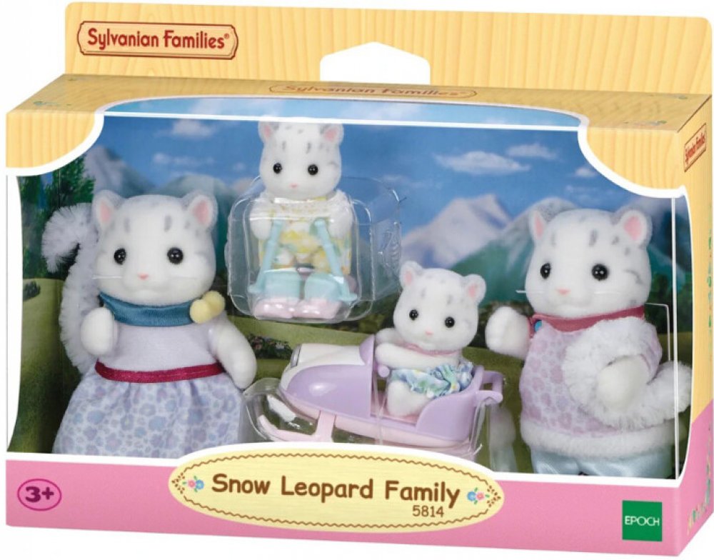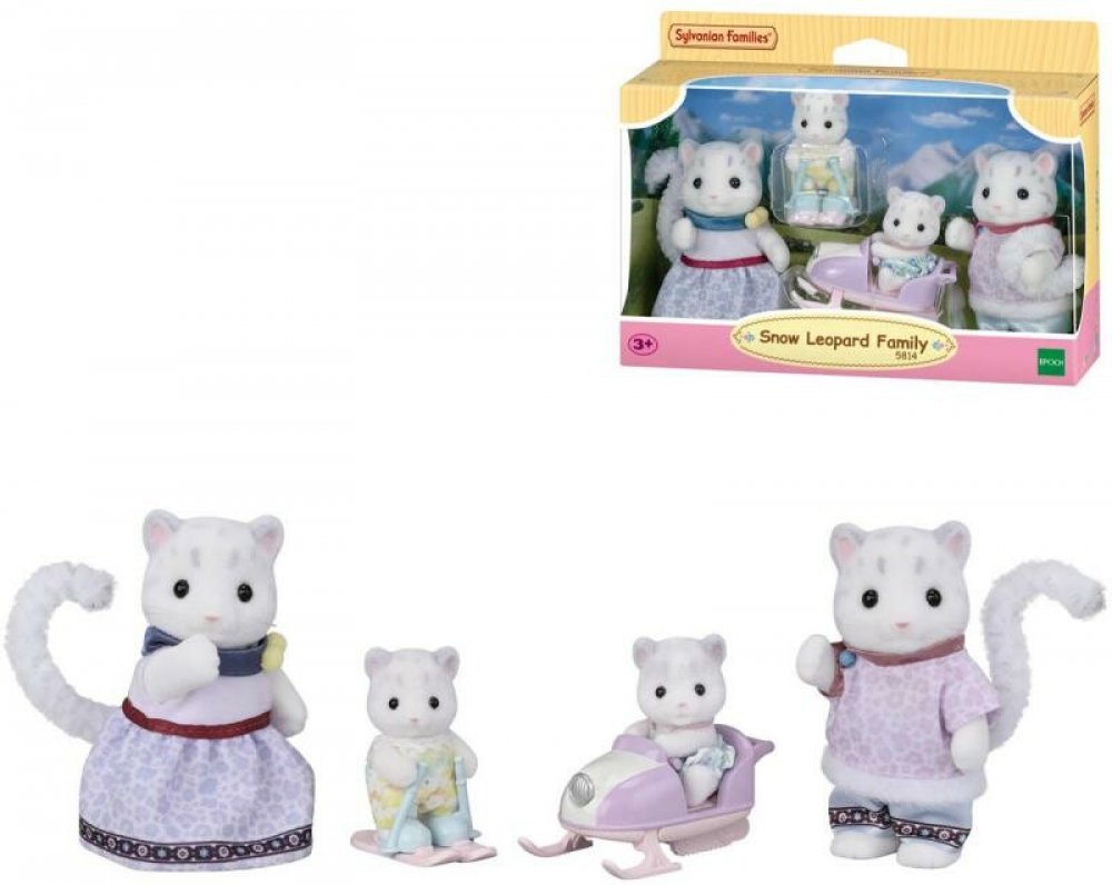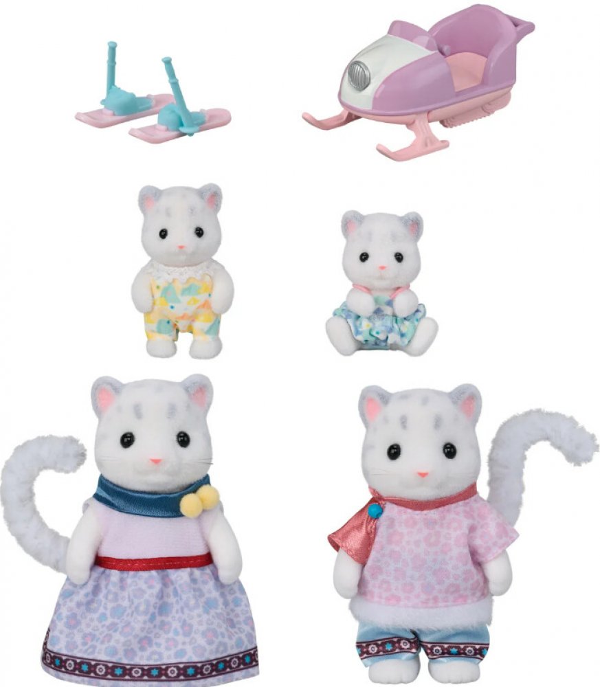 Poznejte rodinu sněžných levhartů os Sylvanian Families. Sada obsahuje 4 roztomilé figurky rodiny sněžných levhartů pokryté měkkým semišem. Tato sada obsahuje tatínka, maminku, dvě dcery a doplňky v podobě sněžného skútru a jednoho páru lyží. Rodiče sněžných levhartů mají charakteristický dlouhý ocas. Celá rodinka má oblečení v jemných pastelových barvách. Táta Gerald miluje rybaření u jezera Kira a zároveň se rád dívá na hory.