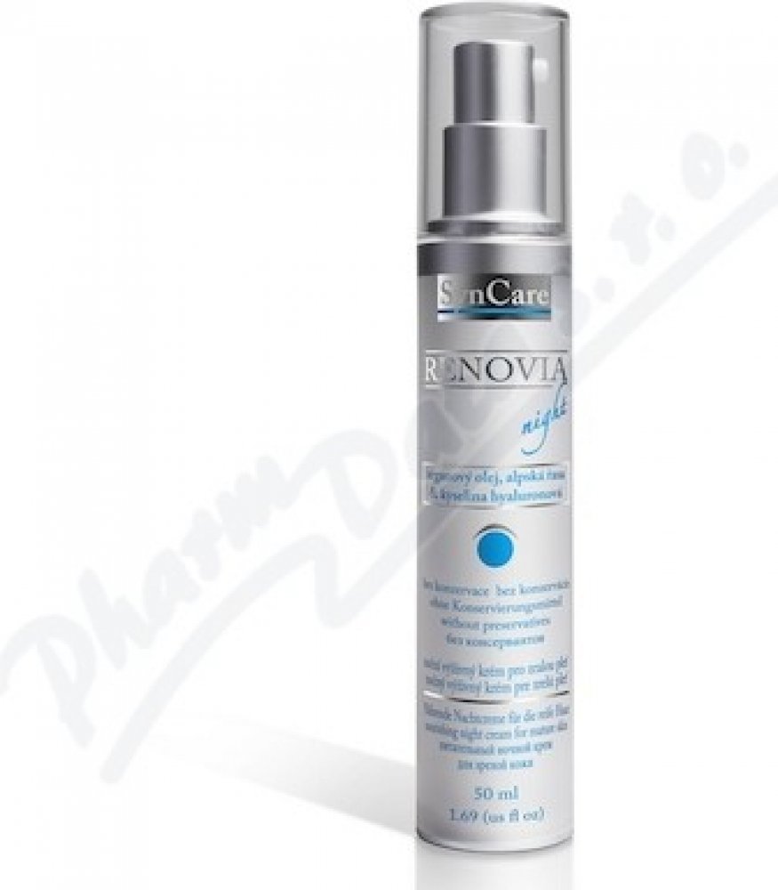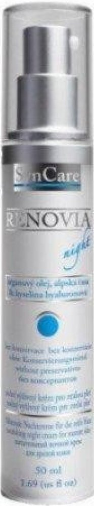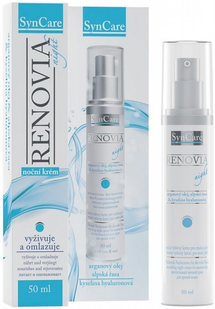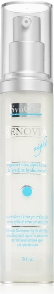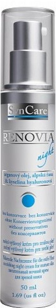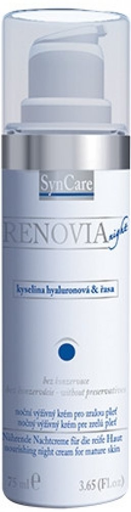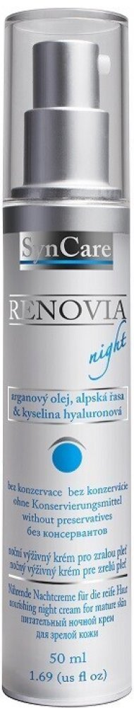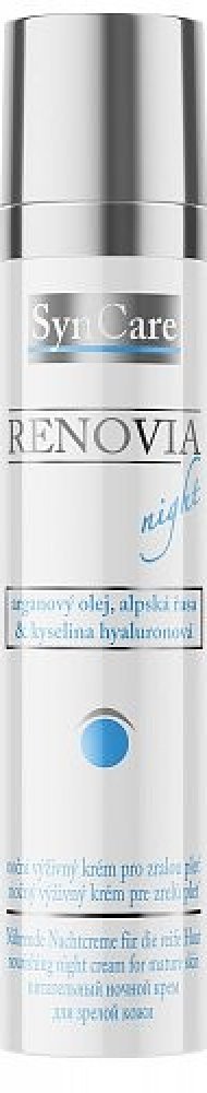 Noční výživný krém Renovia značky Syncare je prvním přípravkem, který kombinuje hydratační účinky kyseliny hyaluronové s omlazujícím efektem retinolu a výživným působením ceramidů. Je určen pro zralou pokožku. Bohatý krém se rychle vstřebá a zanechá pokožku jemnou a vyhlazenou. Krém Renovia regeneruje zralou pleť během spánku. Krém obsahuje tyto aktivní látky: kyselina hyaluronová 0,3 %, retinol 2...