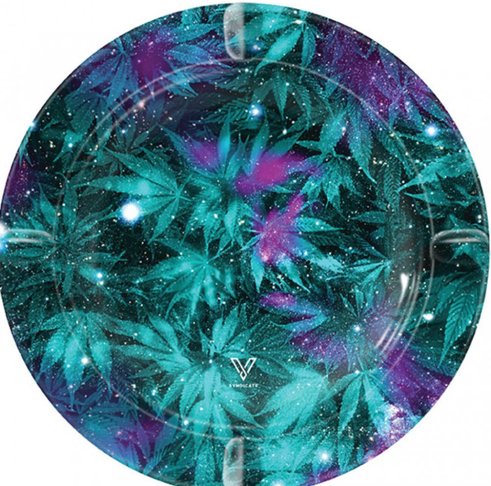 Stylový kovový popelník s galaktickým motivem listů v zeleno-fialových barvách. Odolný, lehký a ideální pro každodenní použití doma i venku.