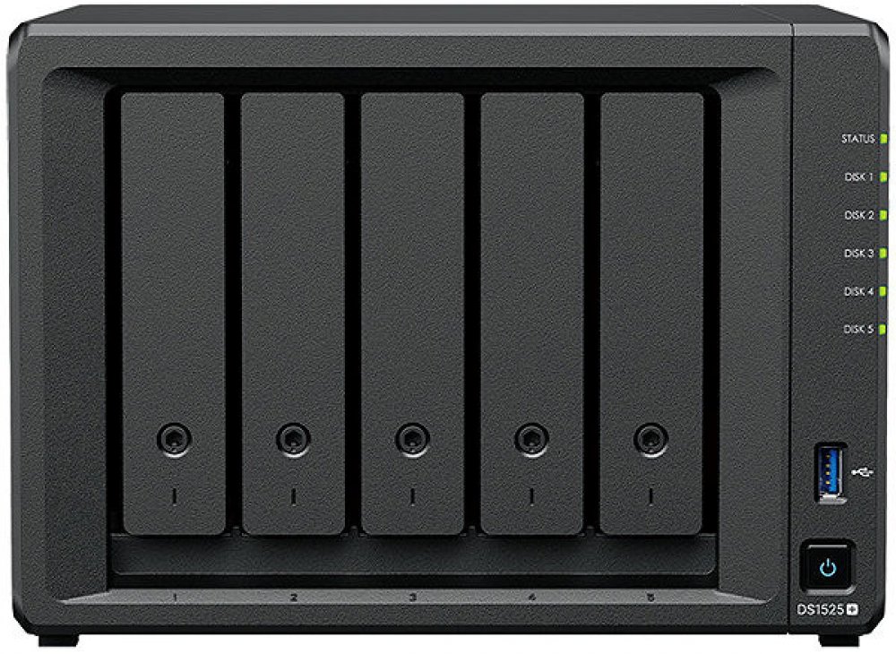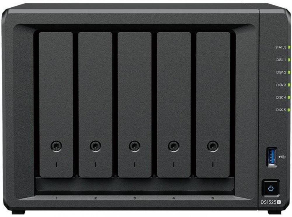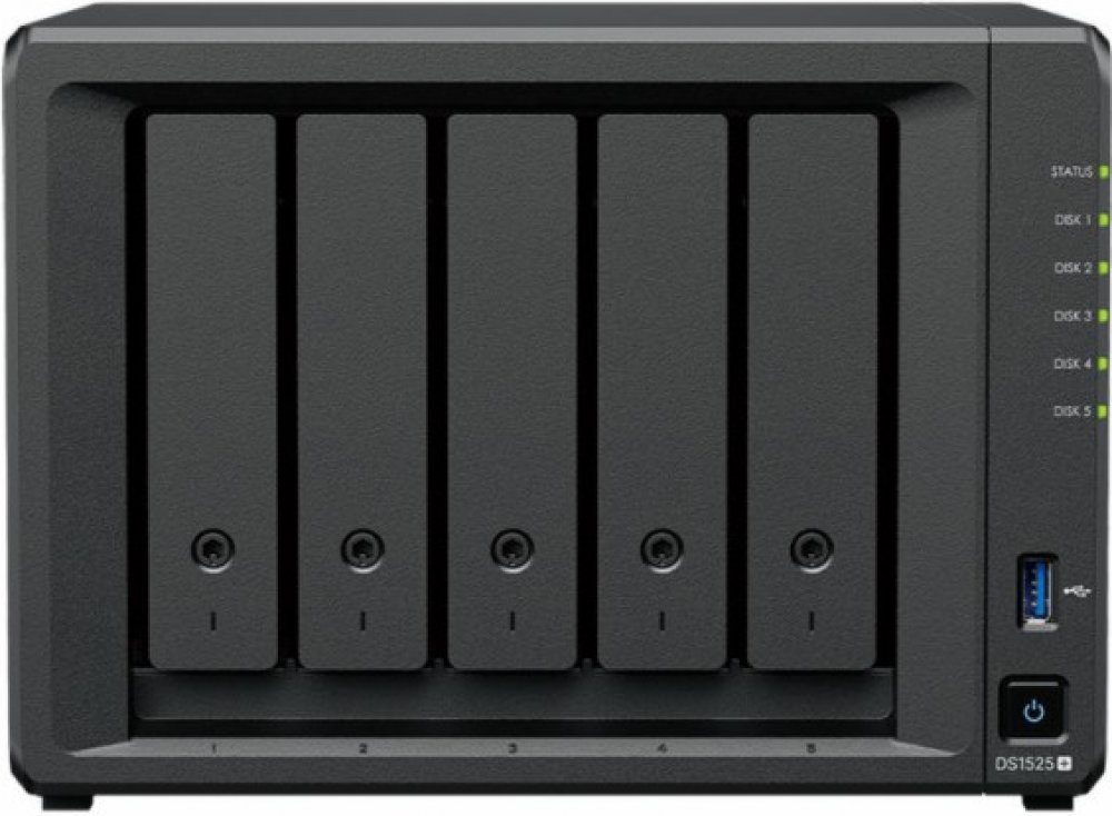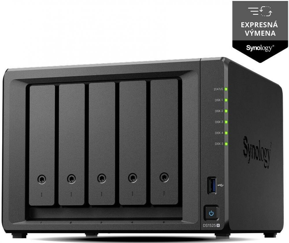 Zařízení DS1525+ nabízí vestavěné síťové připojení 2.5GbE a volitelně 10GbE a podporuje disky SATA SSD i pevné disky HDD v 2,5palcových nebo 3,5palcových vnitřních šachtách i disky M.2 NVMe přes sloty M.2 pro použití jako mezipaměť.