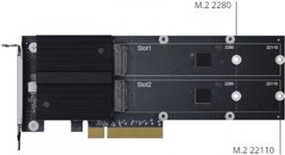Zrychlete si mezipaměť svého zařízení NAS pomocí interní PCIe rozšiřující karty. Díky dvěma slotům s M.2 konektory můžete ke svému NAS zřízení přidat 2 SSD disky s podporou NVMe. Rozšiřující kartu využijete především pro zrychlení náročnějších datových toků, jako jsou například indexování fotografií, hledání souborů nebo virtualizované prostředí.