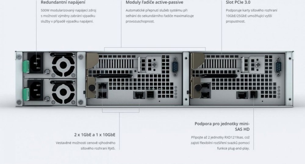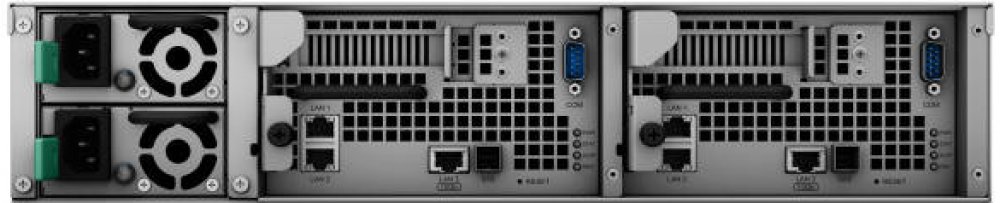 Rackový server NAS formátu 2U je cenově dostupné řešení pro firmy hledající efektivní centralizovanou správu dat. Maximální funkčnost a redundanci zajišťují dva řadiče s architekturou active-passive vzájemně propojené spolehlivým vysokorychlostním netransparentním mostem (NTB). Společně s vestavěnou službou Synology High Availability je zařízení určeno k poskytování ochrany v reálném čase na úrovni systému s cílem maximalizovat dostupnost služeb a minimalizovat přerušení provozu systému.
