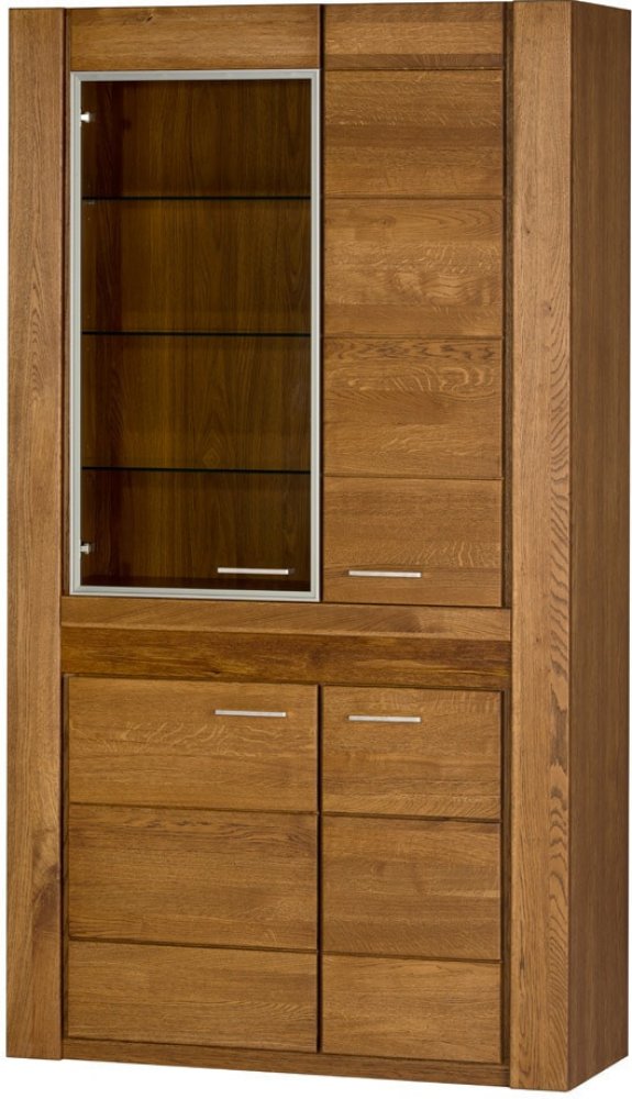 Vitrína Velvet - expozice a ukládání Vitrína čtyřdveřová spojuje prosklenou část s uzavřenými zónami, díky čemuž umožňuje současně vystavit dekorace a udržet pořádek. Při rozměrech 111 × 199 × 42 cm poskytuje mnoho místa a vestavěné osvětlení usnadňuje prezentaci obsahu i používání po setmění. Uspořádání vnitřku vitríny Za proskleným čelem se nacházejí 3 skleněné police - ideální k vystavení nádobí či památek. Za horním pravým čelem jsou umístěny 2 praktické police z desky, a spodní část tvoří dvojité čelo s policí rozdělenou svislou přepážkou. Takové členění pomáhá logicky rozdělit uložené věci a rychle najít to, co je potřeba. Pevné provedení Čelo je vyrobeno z masivního dubového dřeva, což se promítá do odolnosti a stability. Vnější korpus je dokončen přírodní dubovou dýhou a vnitřní je vyroben z nábytkové desky v dekoru podobném dřevu. Tvrzené skleněné police zvyšují bezpečnost používání a nosnost expozice. Pohodlí na každý den Panty s tichým dovíráním způsobují, že se čela zavírají jemně, bez práskání, což chrání hrany a zvyšuje komfort používání. Kovové úchyty firmy Nomet zajišťují jistý úchop a pohodlné otevírání každého z čel. Použití v domácnosti Vitrína se osvědčí v obývacím pokoji nebo jídelně: prosklená část vystaví dekorace a plná čela pojmou každodenní doplňky. Hloubka 42 cm usnadňuje postavení nábytku u stěny při zachování dobré kapacity. Připravená k použití a doplňky Nábytek je hotový, prodávaný ve smontovaném stavu - ihned je vhodný k postavení na vybrané místo a solidní hmotnost 91 kg podporuje stabilitu. Je k dispozici možnost dokoupení sady pro péči a také dodatečné sady korunového osvětlení pro skleněné police, aby ještě lépe vynikla expozice. Charakteristické rysy vitrína se 4 dveřmi (1 dveře prosklené) Za prosklenými dvířky se nacházejí 3 skleněné police. za horní, pravou čelní částí 2 police z desky za dvojitým čelem police rozdělená vertikální přepážkou Provedení panty s tichým dovíráním kovové úchyty od firmy Nomet Čelo: masivní dub