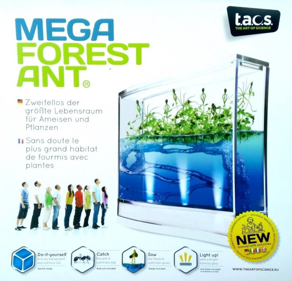 Mravenčí gelové akvárium Mega Forest Ant LED Antquarium je gelové akvárium a LED osvětlením určeno pro sledování života mravenců, pěstovat rostlinky a sledovat jejich nadzemní i podzemní část.Pomocí LED diod v základně se gel a vše v něm promění v úžasnou podívanou i večer a za tmy. Za pomocí speciálně vyvinutého průhledného gelu, který je zároveň výživou mravenců, můžete sledovat život mravenčí kolonie, tvorbu tunelů, tajných komor a zásobáren.Stejně tak uvidíte interakci mezi jednotlivými mravenci a jejich pracovní systém. Navíc je Forest Ant Ecoterrarium unikátním skleníkem, kde kromě života mravenců můžete pěstovat rostlinky a sledovat jejich nadzemní i podzemní část. Sada obsahuje speciální postup a ingredience na výrobu gelu! Děti tak mohou kromě sledování hmyzu a rostlinek rozšířit své znalosti i při výrobě gelu.Osah balení: průhledné MEGA terárium s víkem (rozměry včetně LED podstavce š26 x v22 x h6cm), vícebarevné LED osvětlení (4x RGB LED) zabudované v podstavci, napájení přes USB nebo baterie 3x LR44 (kabel USB ani baterie nejsou součástí) ingredience pro výrobu gelové náplně (postup výroby je velmi jednoduchý, popsáno v návodu nebo ukázka na youtube zde) semínka rostlinek dřevěná tyčka nádobka na chytání mravenců lupa český návod