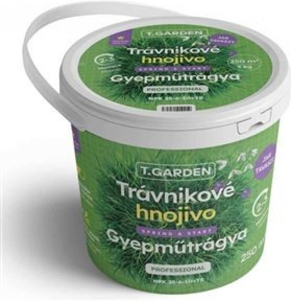 Jarní trávní hnojivo T.Garden Spring and Start 25-6-10 - 5 kgProbuďte svůj trávník k životu po zimě.Jarní hnojivo T.Garden Spring and Start 25-6-10 je speciálně vyvinuté pro regeneraci trávníku po zimním období. Díky vysokému obsahu dusíku podporuje rychlý růst, hustotu a intenzivní zelenou barvu trávníku. Unikátní technologie E-Max zajišťuje dlouhodobé uvolňování živin až po dobu 3 měsíců, čímž přispívá k zdravému vývoji travního porostu bez nežádoucího přerůstání.Klíčové vlastnosti Rychlá regenerace trávníku Vysoký obsah dusíku podporuje růst a obnovu po zimním období. Dlouhodobé působení Technologie E-Max umožňuje postupné uvolňování živin až 3 měsíce, což minimalizuje riziko přehnojení. Odolnost proti chorobám, mechu a plevelům Vyvážené složení posiluje trávník a zvyšuje jeho odolnost vůči stresu. Snadná aplikace Granulované hnojivo se jednoduše aplikuje rozmetadlem nebo ručně. Optimální výživa pro všechny trávníky Vhodné pro zahrady, sportovní plochy i okrasné trávníky.Použití a aplikaceJarní hnojivo Spring and Start se doporučuje aplikovat od března do června, kdy trávník po zimě potřebuje intenzivní regeneraci a dostatek živin pro zdravý růst. Technické parametry Značka: T.Garden Balení: 5 kg Vydatnost: 250 m2 Forma: Granulované hnojivo Granulace: Standardní velikost pro snadné rozmetání Obsah živin: Dusík (N): 25 % Fosfor (P): 6 % Draslík (K): 10 % Délka účinku: 2–3 měsíce Aplikace: Jaro (březen–červen)