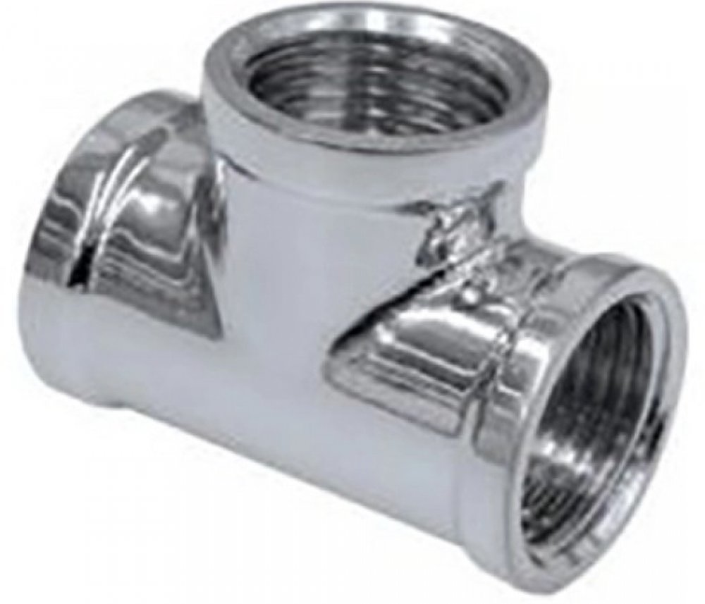 Mosazná chromovaná závitová tvarovka pro rozvod vody.