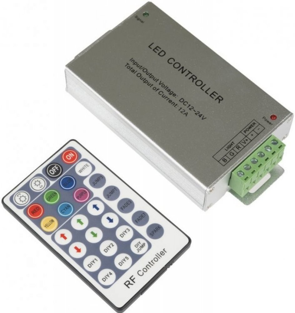 Programovatelný ovladač pro RGB LED pásky - RF (radiofrekvenční ovládání) umožňuje dálkově ovládat intensitu jasu, nastavení barev, barevných přechodů a jejich rychlost u RGB LED pásků a modulů. Přijímač může být ukrytý (za zdí, sádrokartónem či ve skříni), není nutná přímá viditelnost přijímače pro ov...