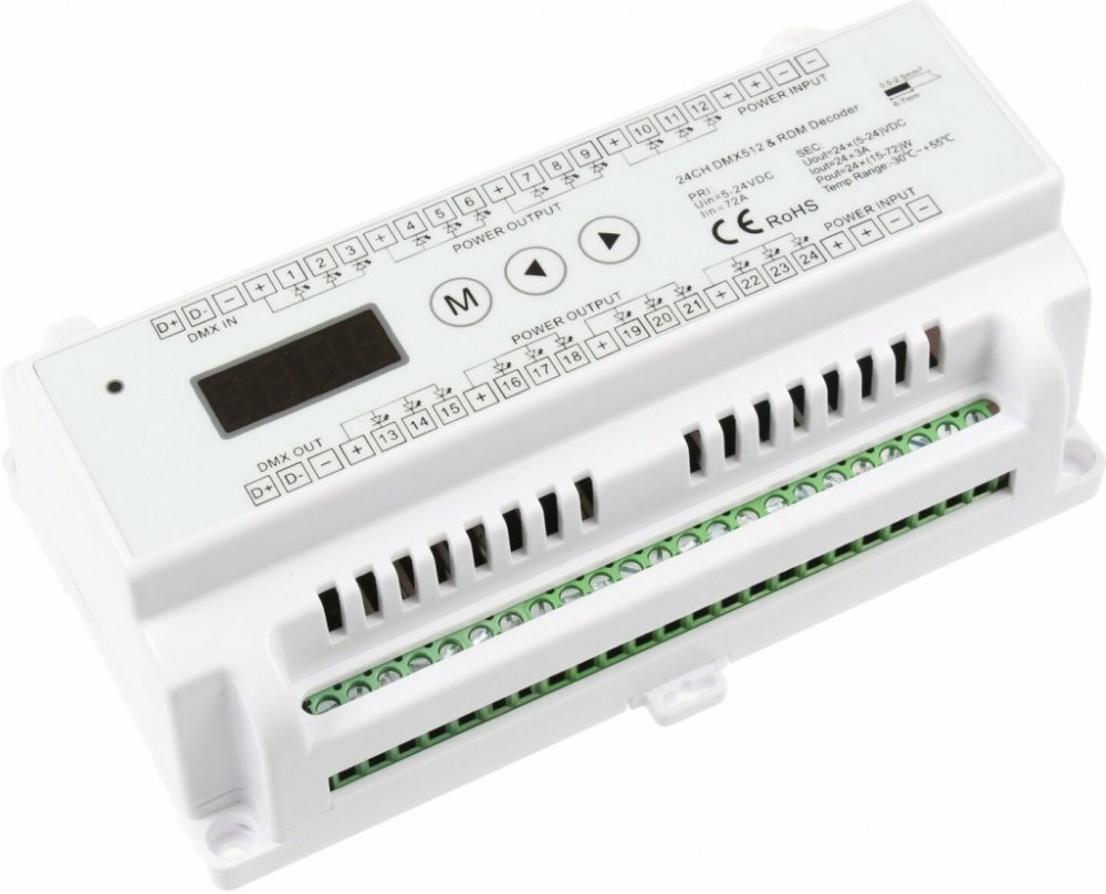 DMX512 24CH je 24-kanálový převodník určený pro ovládání LED systémů se společnou anodou pomocí DMX konzole, mezi které patří například jednobarevné a RGB pásky.