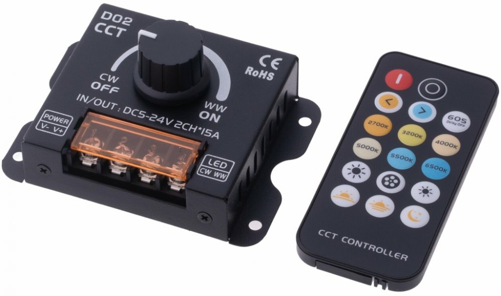 Stmívač a vypínač 1kanálový RF (radiofrekvenční) s dálkovým a manuálním ovládáním intensity jasu CCT LED pásků a CCT LED modulů. Přijímač může být ukrytý (za zdí, sádrokartónem či ve skříni), není nutná přímá viditelnost přijímače pro ovladač. LED ovladač RFM umožňuje ovládat 1 zónu samostatně. Světlo můžete ovládat jak dálkovým ovladačem, tak manuálně kolečkem na přijímači.