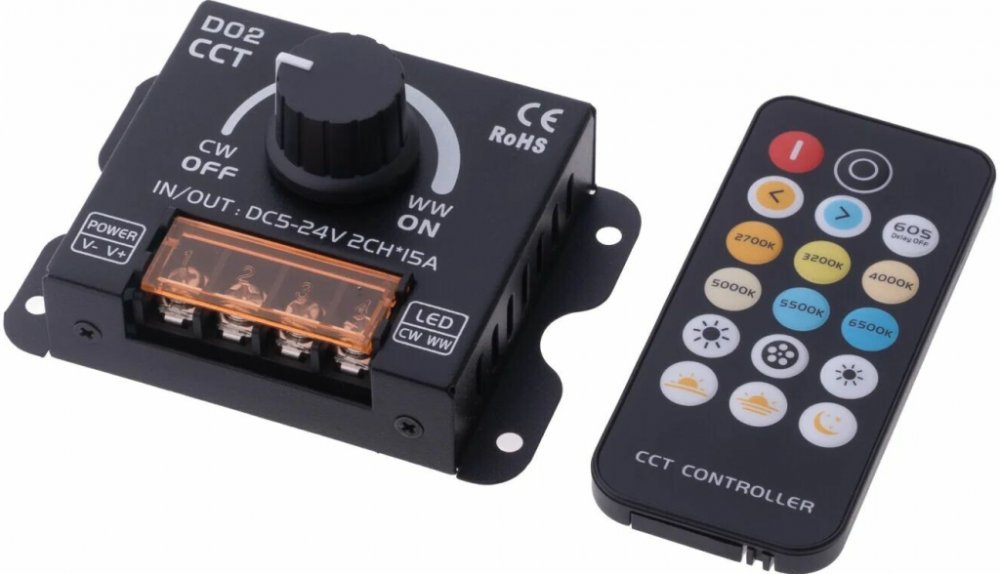 Manuální stmívač s RF dálkovým ovládáním umožňuje pohodlně regulovat jas i teplotu chromatičnosti CCT LED pásků a CCT LED modulů v rozsahu napájení 5–24 V. Ovládání je možné dvěma způsoby – buď otočným kolečkem přímo na přijímači, nebo přiloženým dálkovým ovladačem, který funguje na radiofrekvenci 433 MHz a nevyžaduje přímou viditelnost. Přijímač tak může být skrytý ve zdi, v podhledu nebo ve skříni, aniž by to omezilo dosah ovládání až 15 metrů.