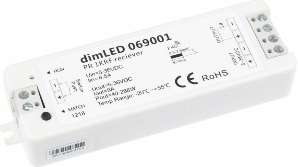 Radiofrekvenční přijímač stmívač pro jednobarevné LED produkty s napětím 5-36V. Přijímač může být ukrytý (za zdí, sádrokartónem či ve skříni), není nutná přímá viditelnost přijímače pro ovladač. Přijímač je kompatibilní se všemi ovladači řady dimLED. Přijímač má svorkovnici pro připojení tlačítka, kterým lze přijímač manuálně ovládat. Lze tedy přijímač ovládat jak dálkově, tak manuálně například tlačítkem. Pro ovládání více okruhů je nutno použít jeden přijímač na každý okruh. Na každý přijímač lze napárovat až 10 různých ovladačů řady dimLED a tak ovládat z několika míst.