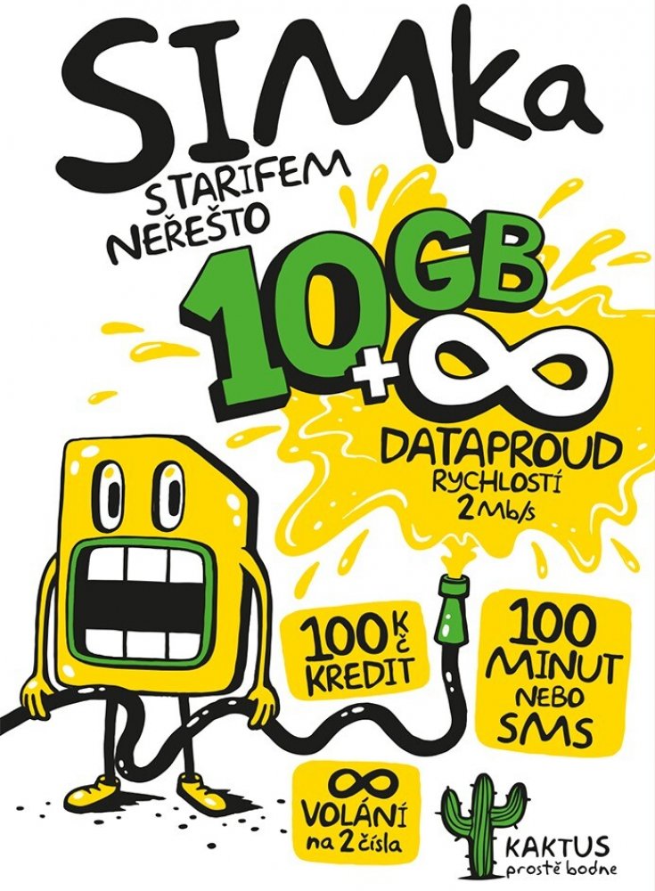 Klíčové vlastnosti SIM karty Kaktus Neřešto za 350Předplacený tarifJednoduchá aktivace v aplikaci nebo samoobsluze Můj kaktus v sekci předplatnéPlatba bude pravidelně strhávána z přidané platební kartyPlatba z kreditu není možná 10 GB dat, po jejich vyčerpání neomezená data se sníženou přenosovou rychlostí 2 Mb/s postačující k zajištění základních služeb (e-mail, mapy, online bankovnictví, sociáln...