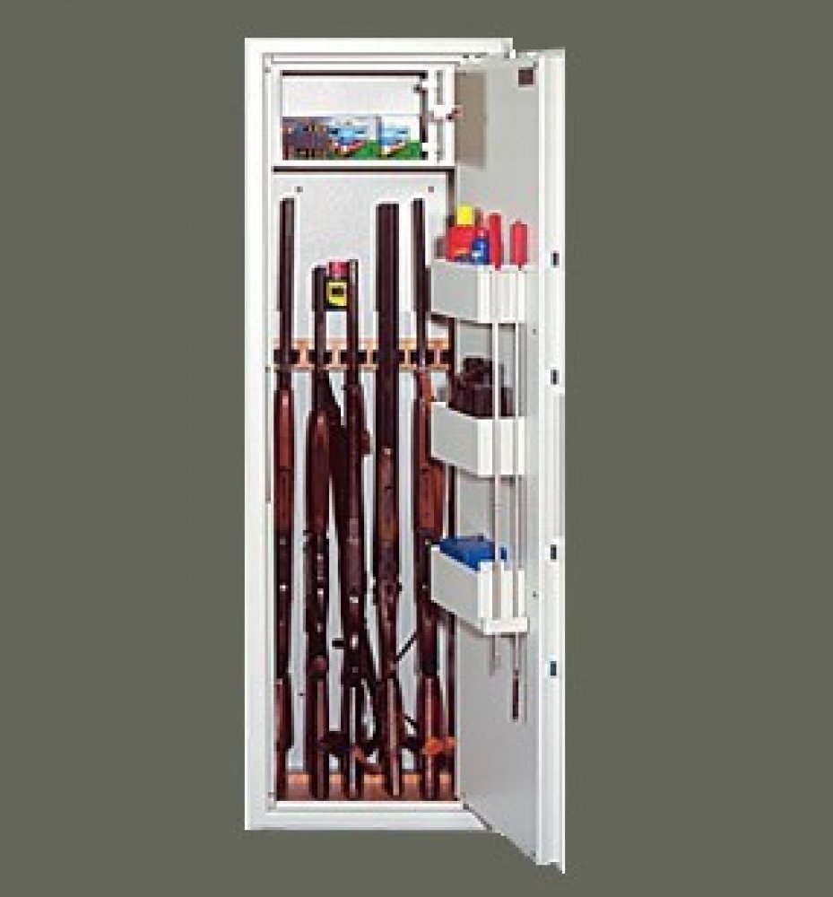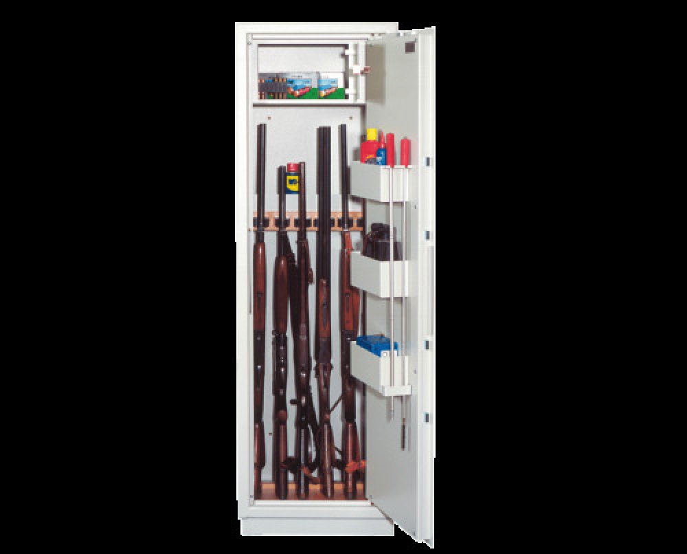 Skříně na zbraně SZ 6 jsou určeny k úschově 3 - 6 ks loveckých, sportovních či starožitných zbraní. Jsou vybaveny vnitřní uzamykatelnou schránkou na střelivo, třemi odkládacími poličkami a držákem na vytěráky. Hlavně zbraní jsou upevněny ve speciálních držácích. Vyrábějí se jako jednoplášťové. Zámkový mechanismus je tvořen třístranným klíčovým trezorovým zámkem.