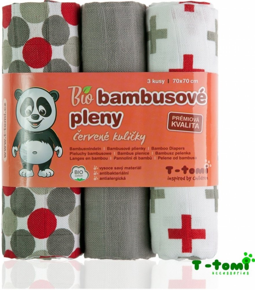 Bambusové vysokogramážní pleny T-tomi s potiskem z bambusového materiálu jsou vyrobeny dvouvrstvou technologií dutinného tkaní. Díky tomuto zpracování jsou bambusové pleny mnohonásobně savější, měkčí a jemnější než klasické bavlněné pleny. Bambusové pleny T-tomi jsou pro své vyjímečné vlastnosti vhodné již pro novorozence. Vlastnosti výrobku: bambusové pleny z dvouvrstvého materiálu materiál viskóza (bambusová) - 70% viskóza (bambusová) + 30% bavlna (BIO kvalita) vysoká kvalita zpracování - všechny okraje založené a zašité vysoká savost a měkkost materiálu pleny jsou antialergické a antibakteriální materiál po vyprání získává na objemuRozměr: 70 cm x 70 cmBaleno: balení obsahuje 3 kusy plen balení obsahuje 2 pleny s potiskem a 1 plenu šedou min. 1 bal.Osušky splňují požadavky stanovené vyhláškou MZČR č.84/2001 Sb. o hygienických požadavcích na hračky a výrobky pro děti do 3 let. Při praní nepoužívejte aviváž, snižuje savost materiálu!!!