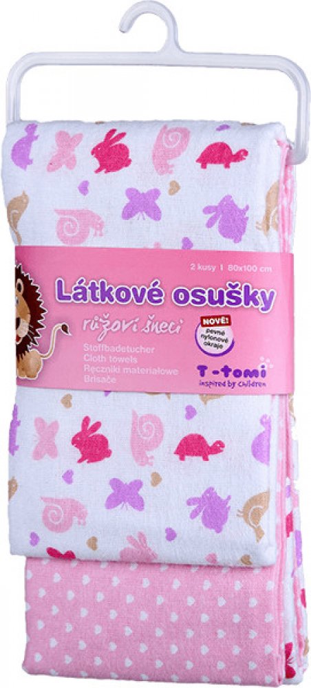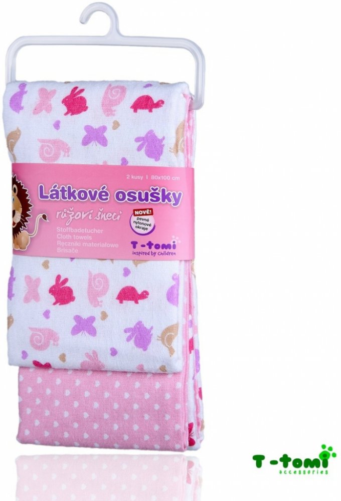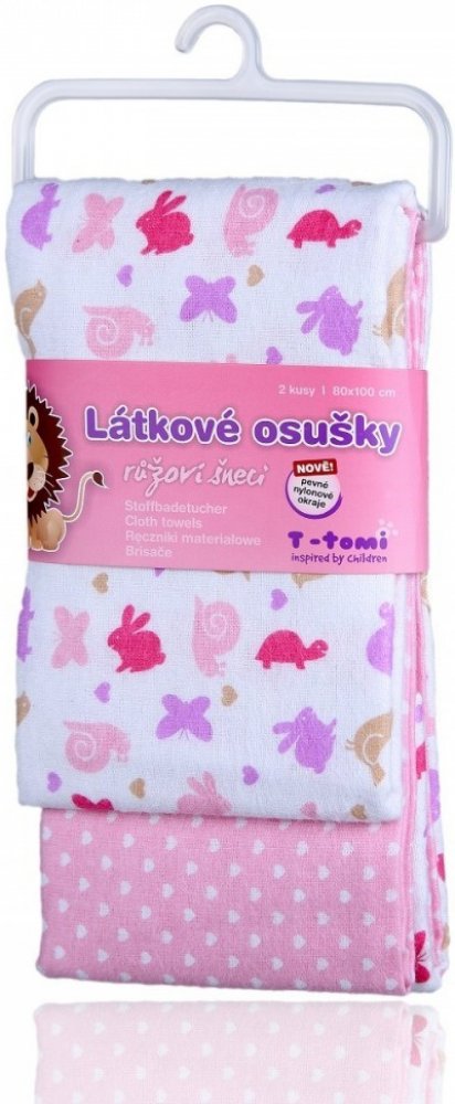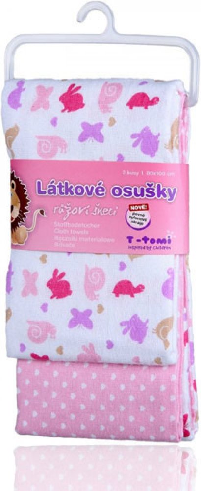 Velice kvalitní osušky pro vaše nejmenší dítka od T-tomi s motivem roztomilých růžových šneků. Je vyrobena z vysokogramážní bavlny spojené s jemným flanelem. Osušku je možné využít nejen jako klasickou osušku na osušení miminka, ale i jako prostěradlo do kočárků a postýlek, nebo také jako lehkou přikrývku a na jiné všestranné využití. Velkou výhodou je skladnost osušky a rychle schnoucí materiál, který je velmi příjemný k dětské pokožce, a nejen děti ocení moderní a zajímavý potisk těchto osušek.