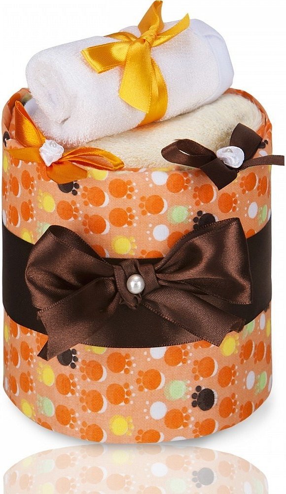 Ručně vyráběný plenkový dort T-tomi je krásným dárkem pro čerstvě narozená miminka nebo maminky v očekávání. Je balen v dárkové krabici s visačkou, na kterou je možné napsat vlastní věnování. \n 1x vysokogramážní látková plena s potiskem T-tomi\n 3x jednorázová plena \n 2x bambusová žínka T-tomi \n 1x luxusní dárková krabice \n 1x dárková kartička pro možnost osobního věnování\n stuhy a ozdoby v b...
