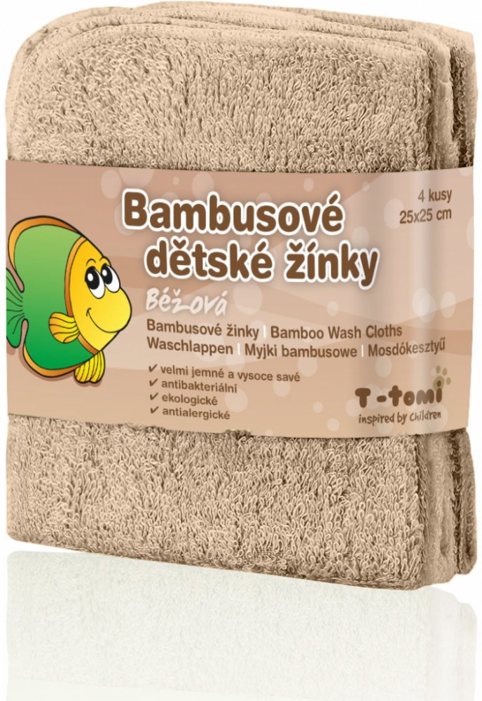 Bambusové dětské žínky T-tomi jsou vyrobeny z vysoce savého a jemného bambusového froté, které je velmi příjemné k citlivé dětské pokožce. Žínky je možné použít nejen ke koupání, ale i na utírání a pro další široké využití. Tato sada obsahuje bambusové žínky v provedení ubrousek, které je velmi praktické na používání. Je možné je využít např i místo jednorázových ubrousků. vysoce savý materiál žínky jsou antibakteriální balení obsahuje 4 kusy žínek balení obsahuje 3 žluté a 1 bílou žínku rozměr 25 x 25 cm praktické a snadné používání Bambusové dětské žínky T-tomi splňují požadavky stanovené vyhláškou MZČR č.84/2001 Sb. o hygienických požadavcích na hračky a výrobky pro děti do 3 let. Při praní nepoužívejte aviváž, snižuje savost materiálu.
