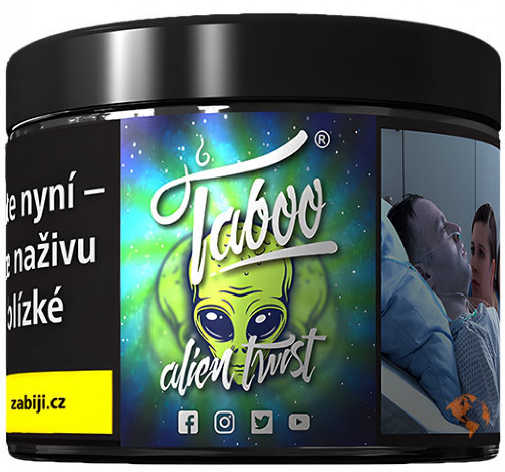 Tento produkt smí koupit pouze osoby starší 18 let.Pouze pro objednávky z České republiky.Alien Twist - příchuť ledové limetkyTabáky Taboo pro vodní dýmky jsou prémiové tabáky pro vodní dýmky německé provenience, které si rychle získaly oblibu v mnoha zemích světa. Tabáky Taboo pro vodní dýmky obsahují světlý virginský tabák špičkové kvality a prvotřídní melasy s aromaty.Tabáky Taboo pro vodní dýmky jsou silou tabáky spíše mírné, vhodné pro každého uživatele vodní dýmky. Hlavní předností tabáků Taboo pro vodní dýmky je jejich dlouhotrvající doba hoření, doprovázená bohatým dýmem a plnou chutí po celou dobu. Navíc výrobce přichází se skutečně zajímavými mixy příchutí.