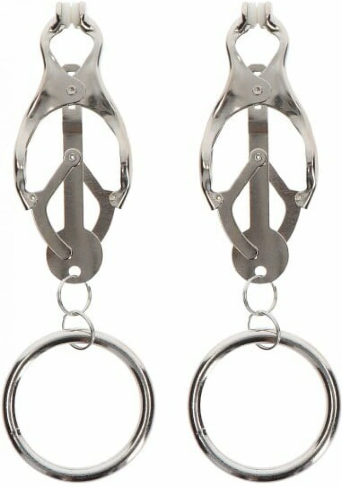 Taboom Butterfly Clamps with Rings kovové svorky na bradavky s kroužkem. Svorky na bradavky nemají nastavitelnou intenzitu sevření, proto nejsou vhodné pro úplné začátečníky v BDSM aktivitách a tzv. „mučení bradavek”.