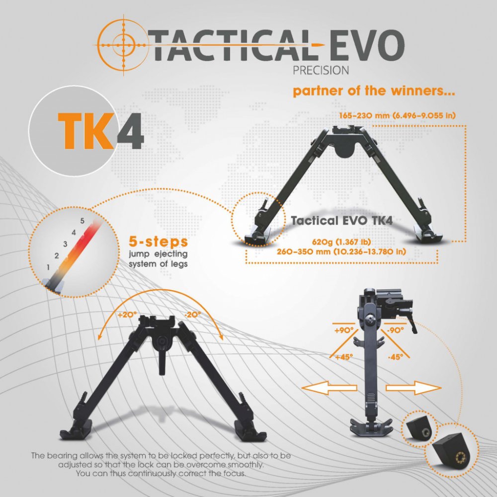 Kvalita výroby, maximální přesnost zpracování a inovativní technická řešení jsou tím, co mnohé konkurenční produkty postrádají. Díky kvalitnímu zpracování a technickému řešení je bipod Tactical TK4 předurčen pro velmi přesnou střelbu na dlouhé vzdálenosti při plnění těch nejnáročnějších úkolů.